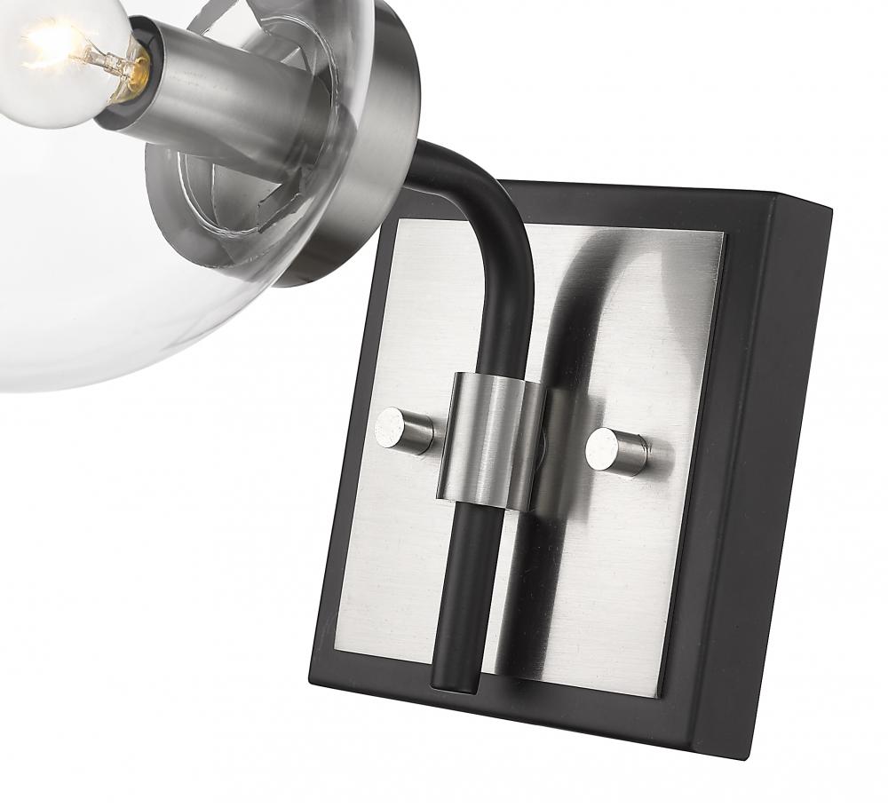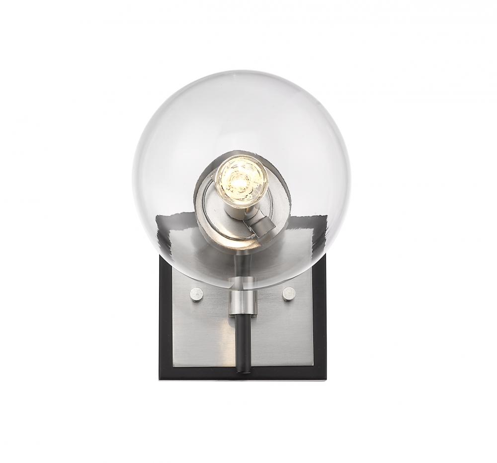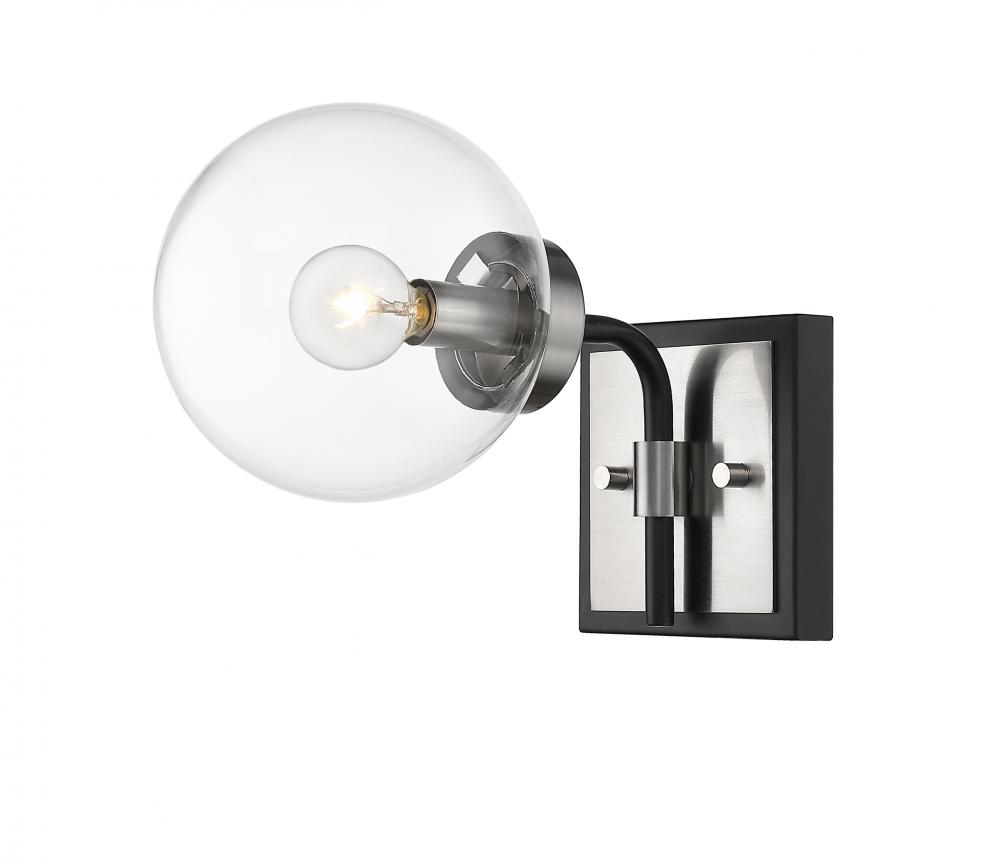 Add this one-light wall sconce to your home for a clean, crisp ambiance. It features a matte black and brushed nickel finish with a clear glass shade that delivers plenty of shine. Install it in a bathroom, powder room, bedroom, or even hallway for a splash of glam with a modern edge.