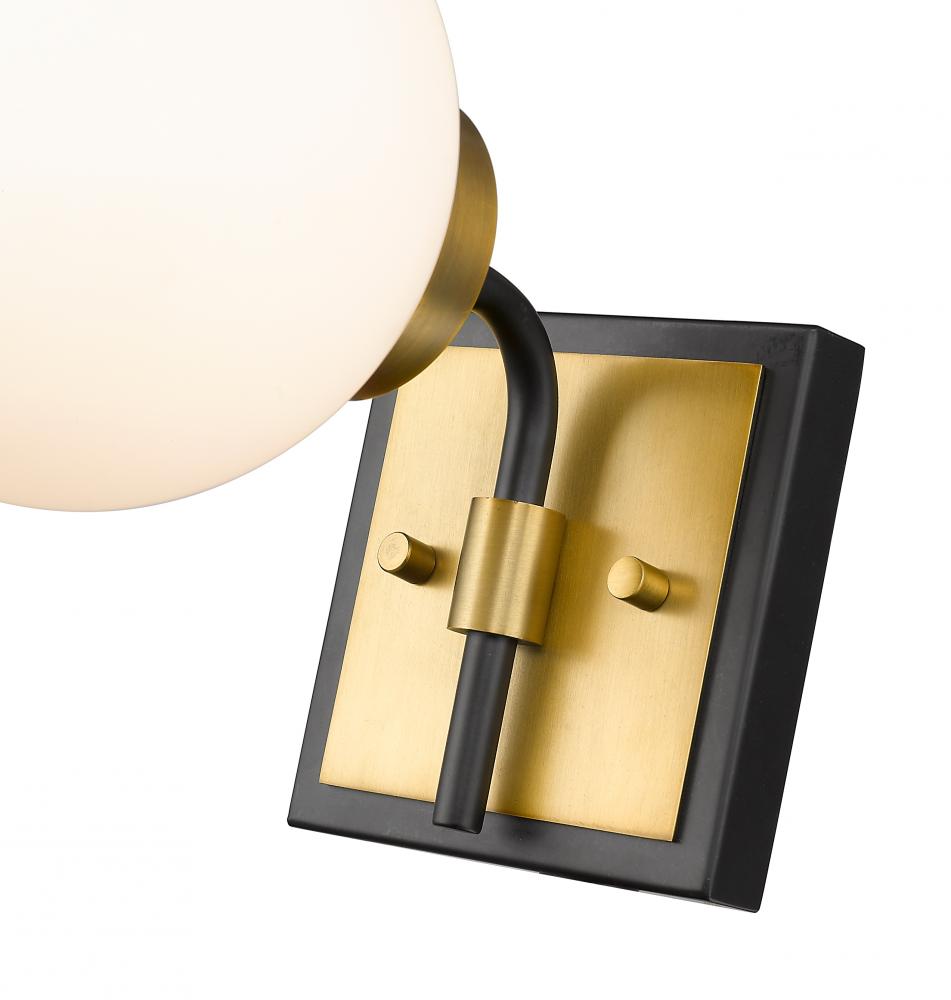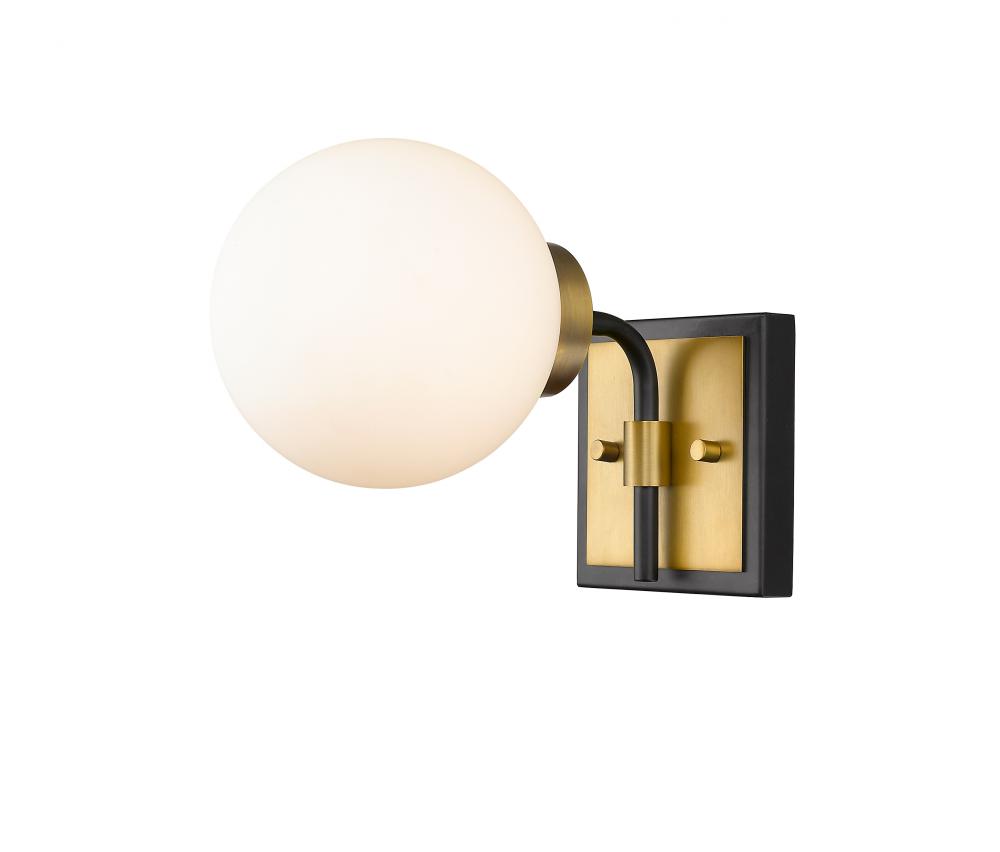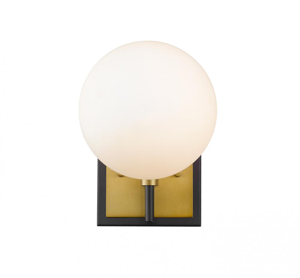 Add this one-light wall sconce to your home for a warm, rich ambiance. It features a matte black and olde brass finish with an opal glass shade that delivers a warm glow. Install it in a bathroom, powder room, bedroom, or even hallway for a splash of understated panache with a contemporary edge.