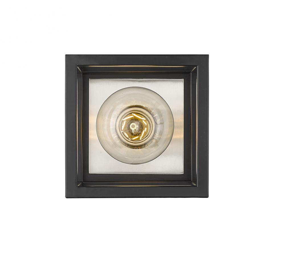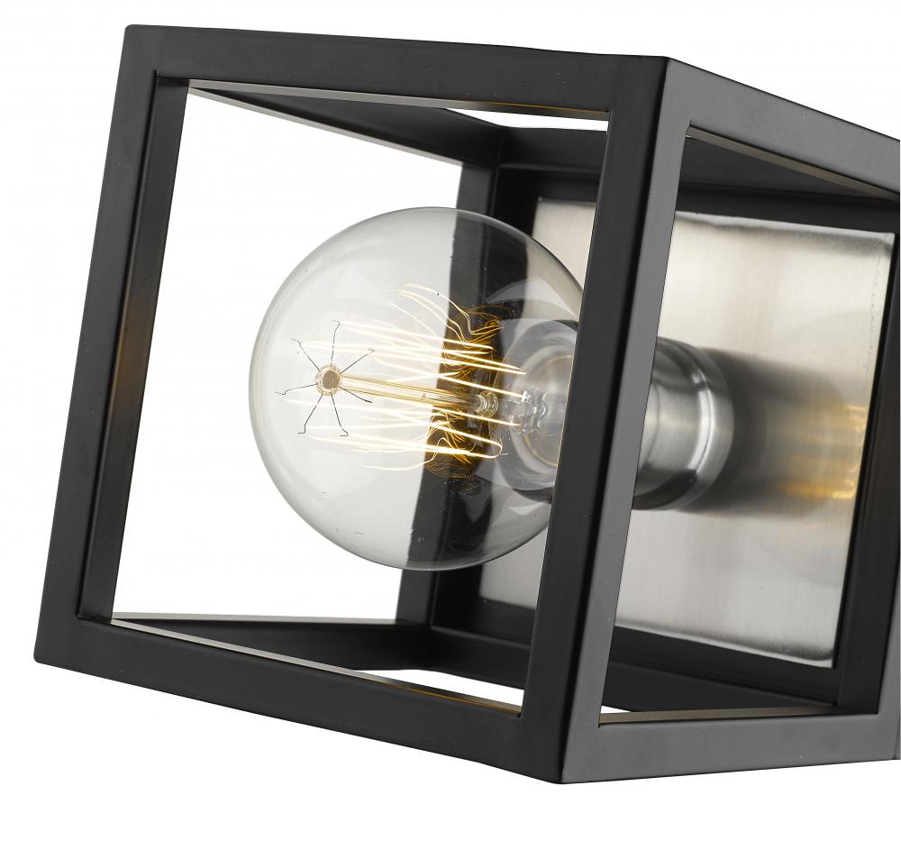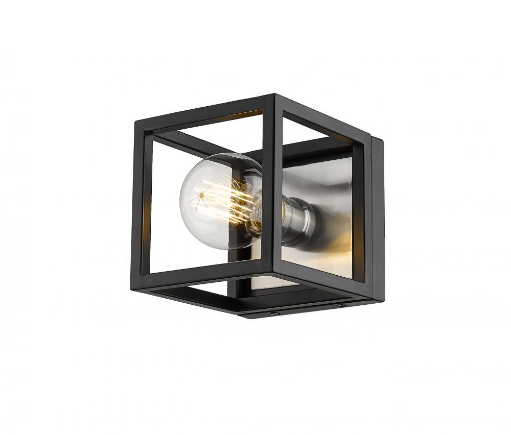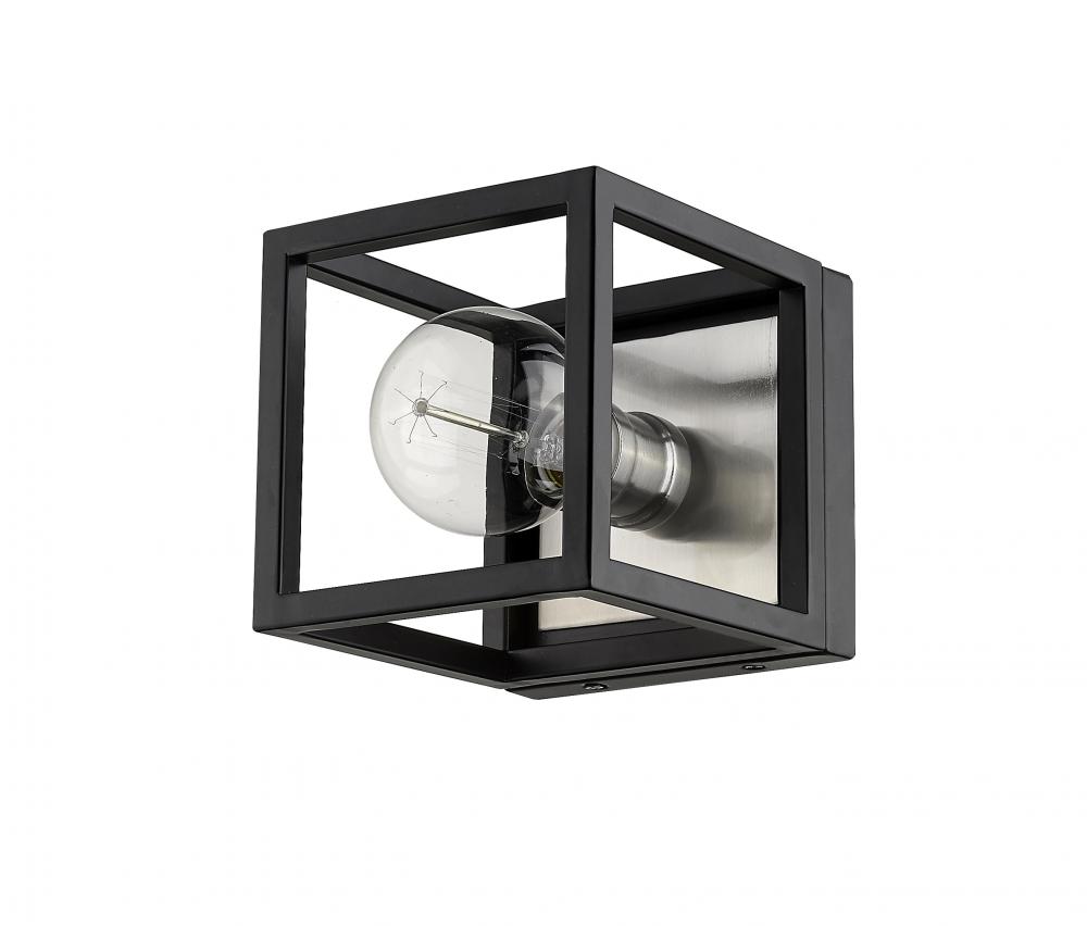 An edgy design highlighted by simple lines makes this two-tone one-light wall sconce an ideal addition to your home lighting collection. It features a classic matte black and brushed nickel finish with a bold square design. Youll love how it enhances the look and feel of any bathroom, powder room, hallway, or bedroom.