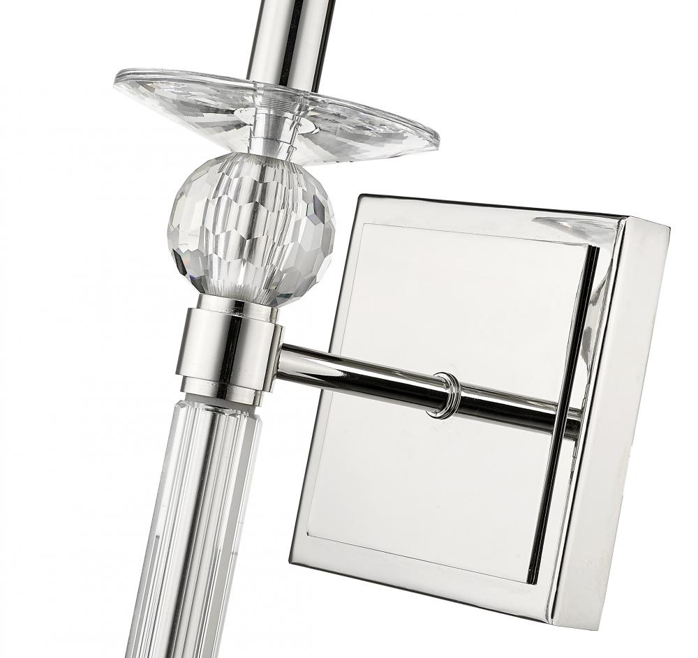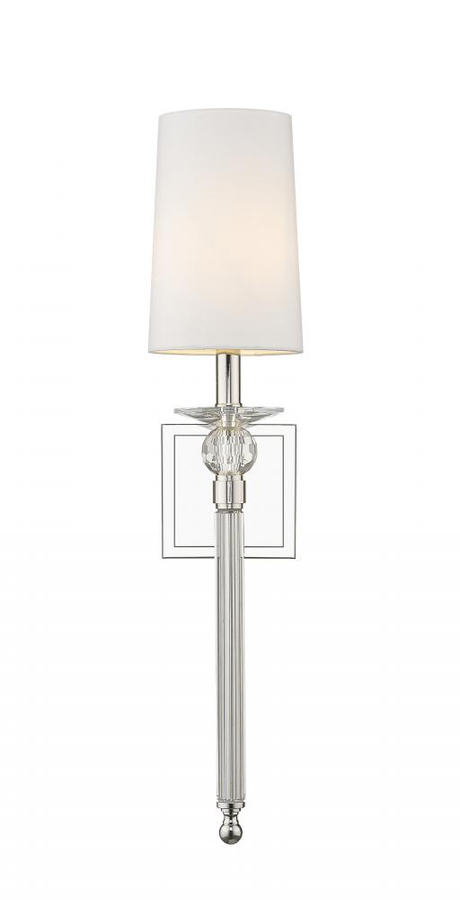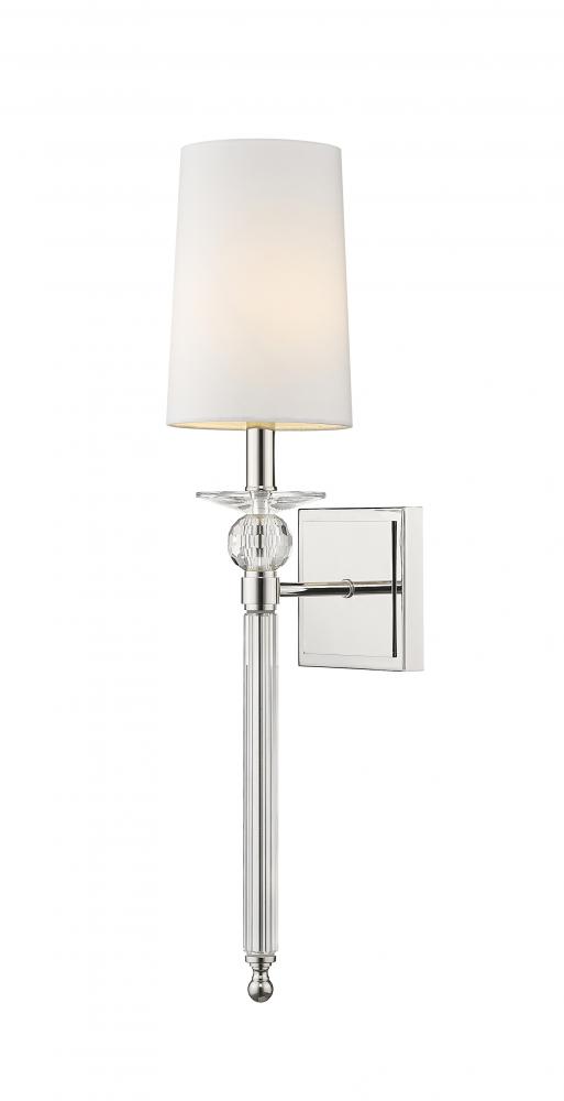 Capture the upscale elegance of a wall-mounted fixture that delivers ambient lighting as it updates the look of a bathroom, bedroom, or hallway. Made from polished nickel finish steel crystal, and topped with a sleek white fabric shade, this one-light wall sconce embellishes a classic design scheme with a traditional lamp motif and artistic crystal accents.
