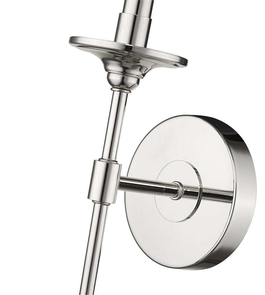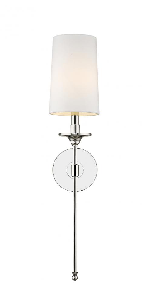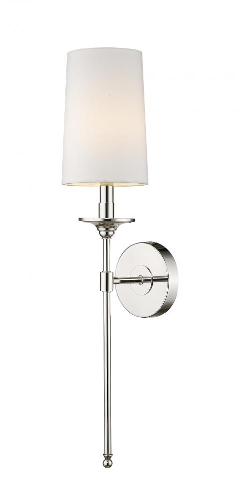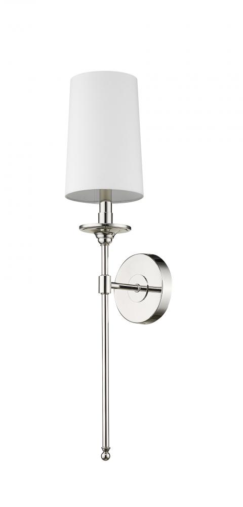 The beauty of polished nickel finish steel stands out in the design of this one-light wall sconce, an ideal selection to enhance a modern or transitional bathroom, bedroom, or hallway. Refined detailing pairs a polished nickel finish wall mount and stem with a fresh white fabric shade, creating a classic look that offers mood-inspiring ambient lighting.