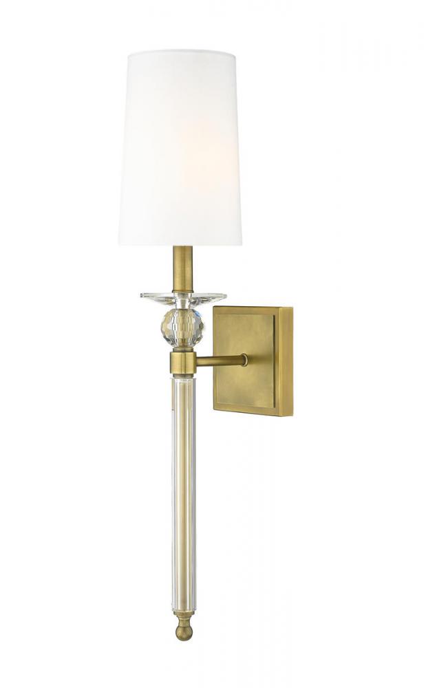 Capture the upscale elegance of a wall-mounted fixture that delivers ambient lighting as it updates the look of a bathroom, bedroom, or hallway. Made from rubbed brass finish steel and crystal, and topped with a sleek white fabric shade, this one-light wall sconce embellishes a classic design scheme with a traditional lamp motif and artistic crystal accents.