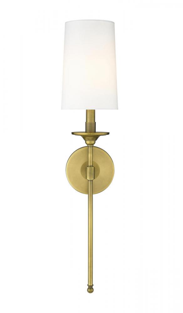 Warm rubbed brass finish steel stands out in the design of this one-light wall sconce, an ideal selection to enhance a modern or transitional bathroom, bedroom, or hallway. Refined detailing pairs a rubbed brass finish wall mount and stem with a fresh white fabric shade, creating a classic look that offers mood-inspiring ambient lighting.