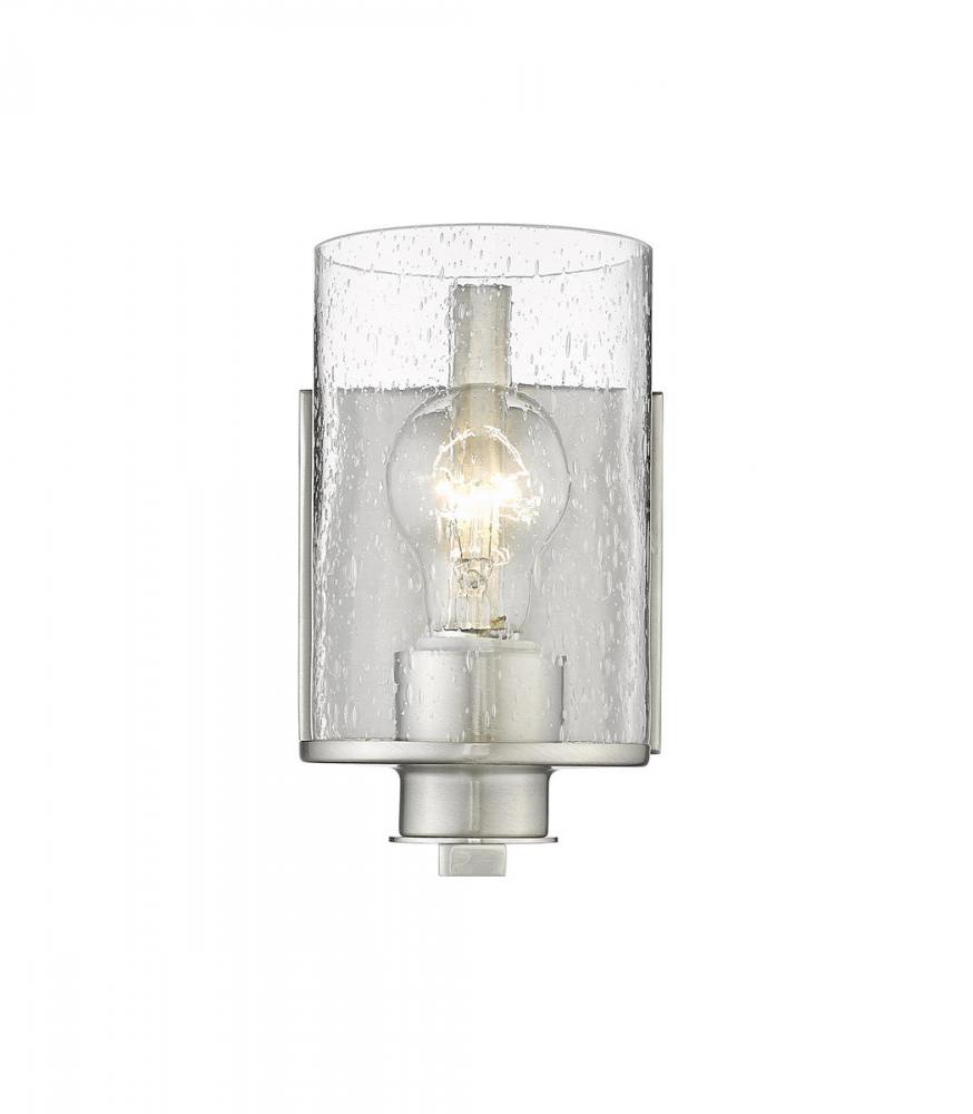 Classic elegance follows this one-light wall sconce from the Beckett collection, a superb choice for a contemporary bath space, hallway, or main living area. A simple yet extraordinary design blends romantic clear seedy glass with a mount, base, and arm crafted of sleek brushed nickel finish steel.