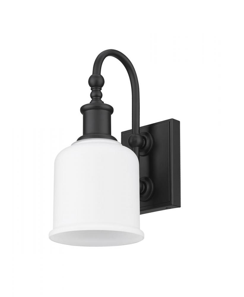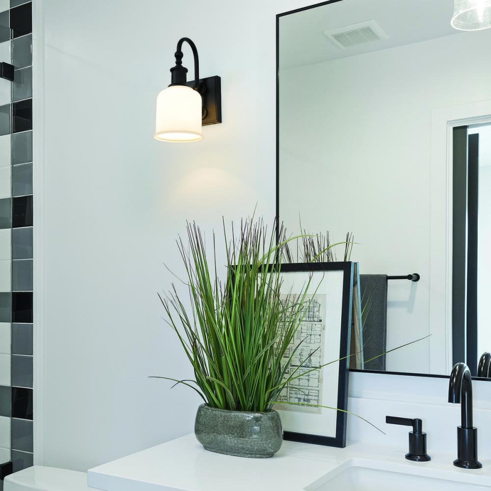 Soft nautical vibes bring a nostalgic romantic vibe to the Bryant one-light wall sconce. Create a themed visual with this tasteful fixture crafted of matte black finish steel, blending beautifully with an opal glass shade. A curved arm and lipped shade generate extra charm that stylizes a custom bath space, dining area, or main living room.
