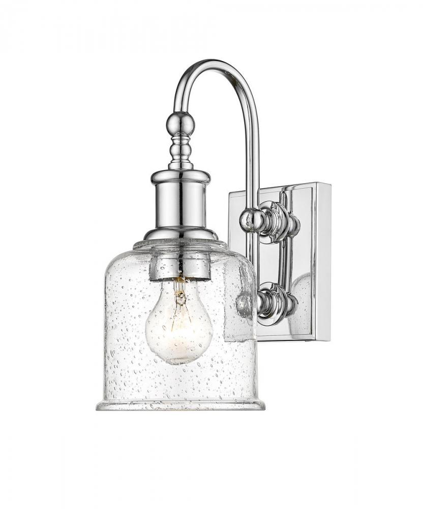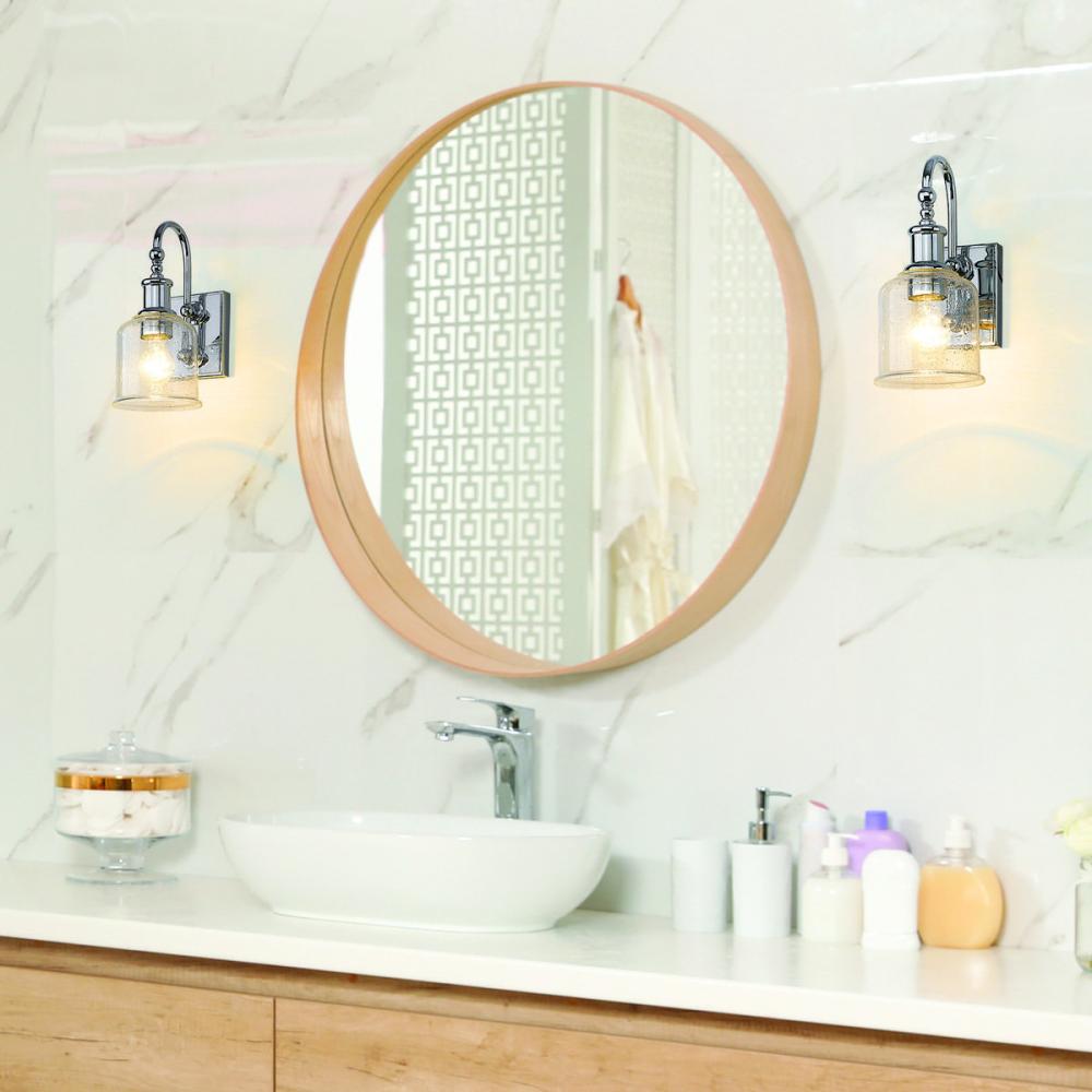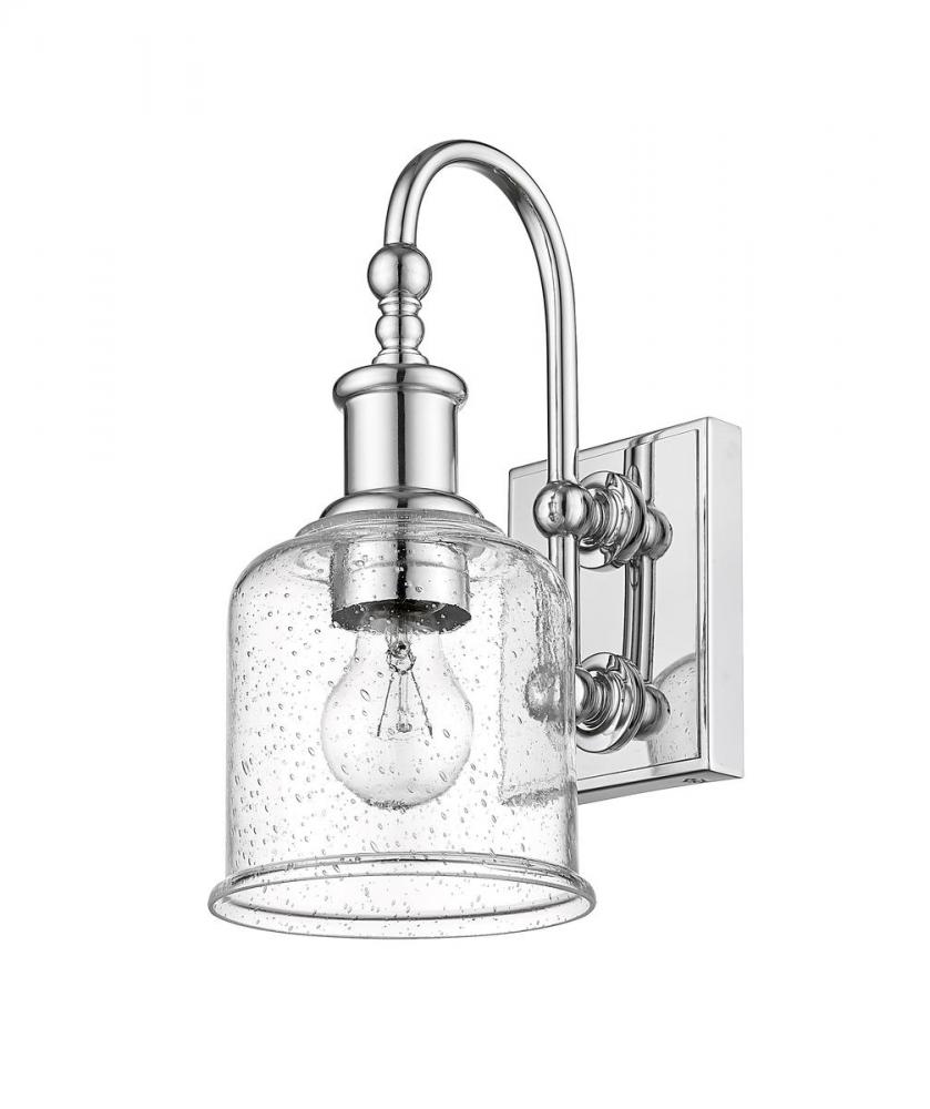 Soft nautical vibes bring a nostalgic romantic vibe to the Bryant one-light wall sconce. Create a themed visual with this tasteful fixture crafted of gleaming chrome finish steel, blending beautifully with a romantic clear seedy glass shade. A curved arm and lipped shade generate extra charm that stylizes a custom bath space, dining area, or main living room.