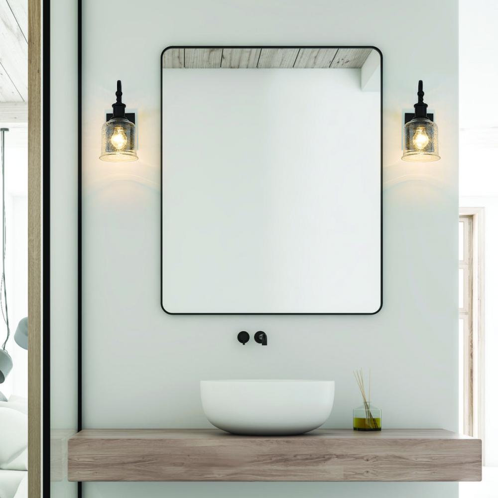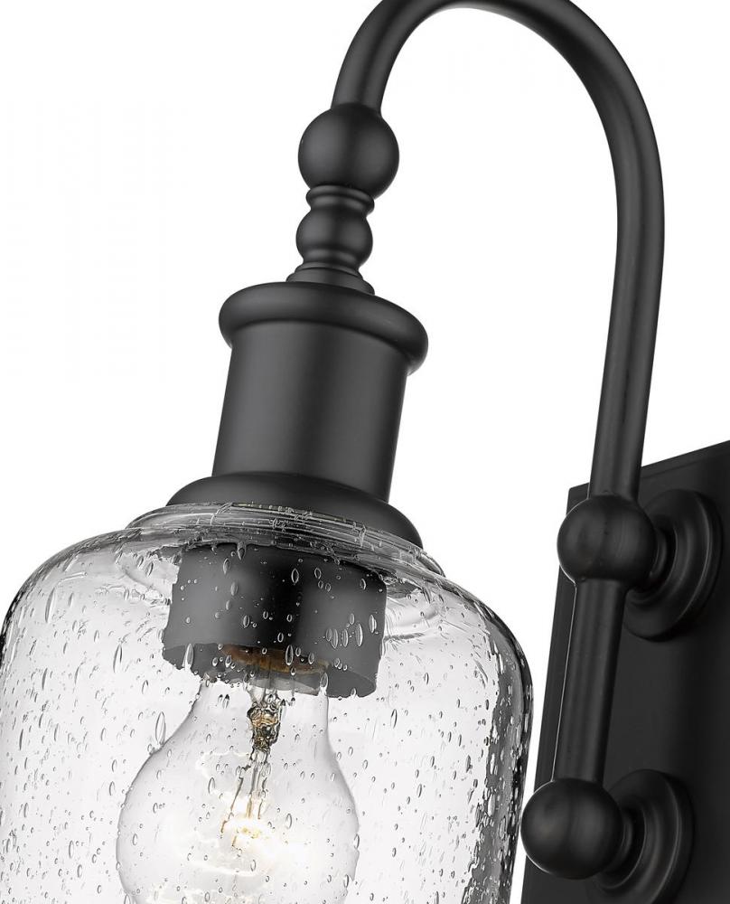 Soft nautical vibes bring a nostalgic romantic vibe to the Bryant one-light wall sconce. Create a themed visual with this tasteful fixture crafted of bold matte black finish steel, contrasting beautifully with a romantic clear seedy glass shade. A curved arm and lipped shade generate extra charm that stylizes a custom bath space, dining area, or main living room.