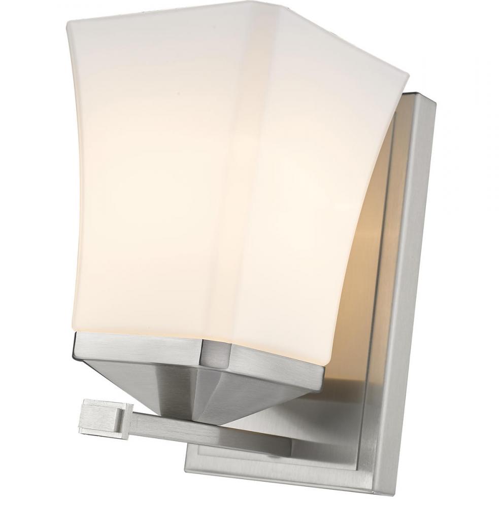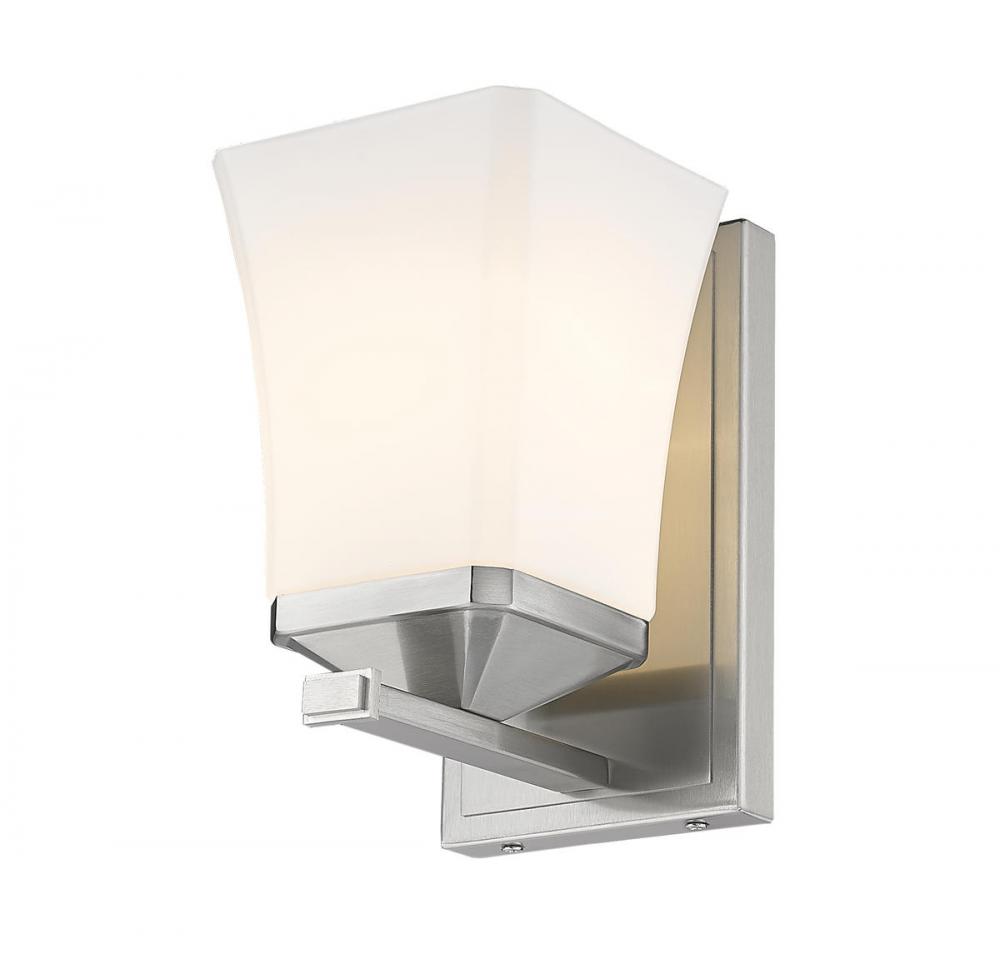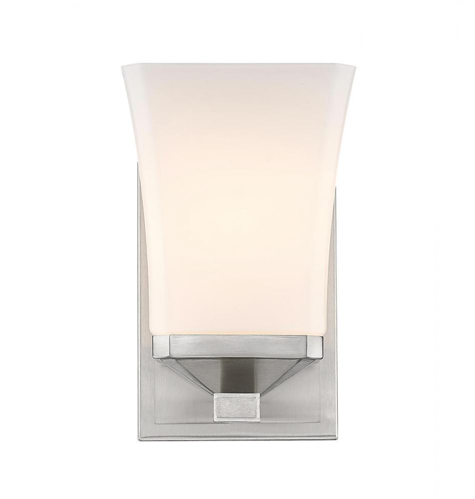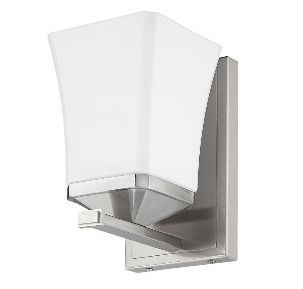 Provide a warm and inviting ambiance to your bathroom with a transitional style wall sconce. The sleek opal etched glass shade makes for ambient lighting. This sconce is constructed from steel with a brushed nickel finish and a flared silhouette.