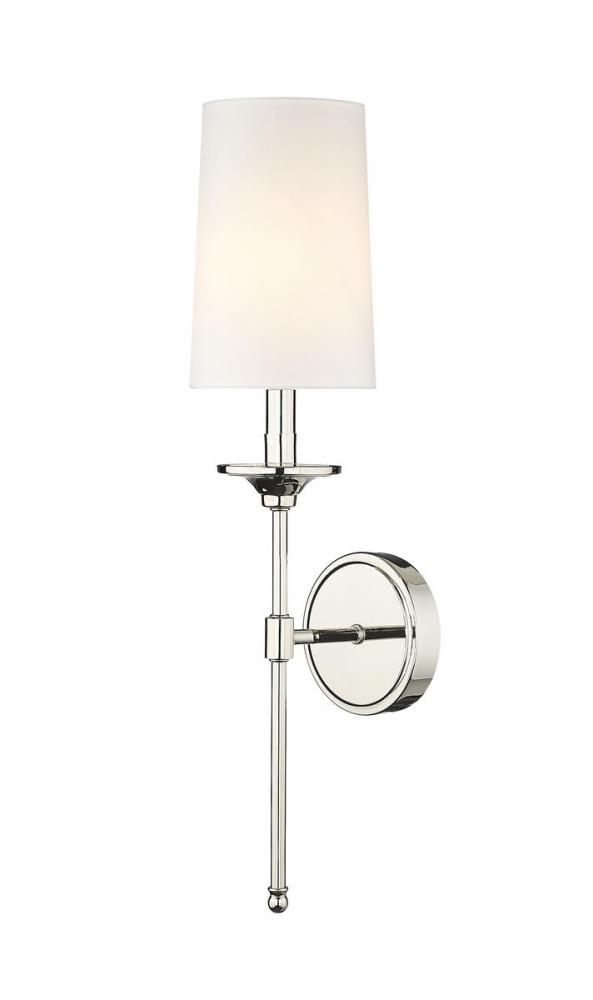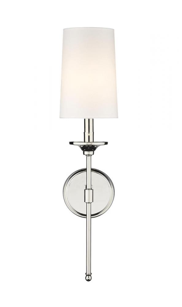 Ideal for a traditional or transitional design scheme, the sleek, elegant Emily sconce creates a warm and inviting atmosphere. This single-light wall sconce features a gleaming, polished nickel finish and a classic cloth shade for a softly diffused glow.