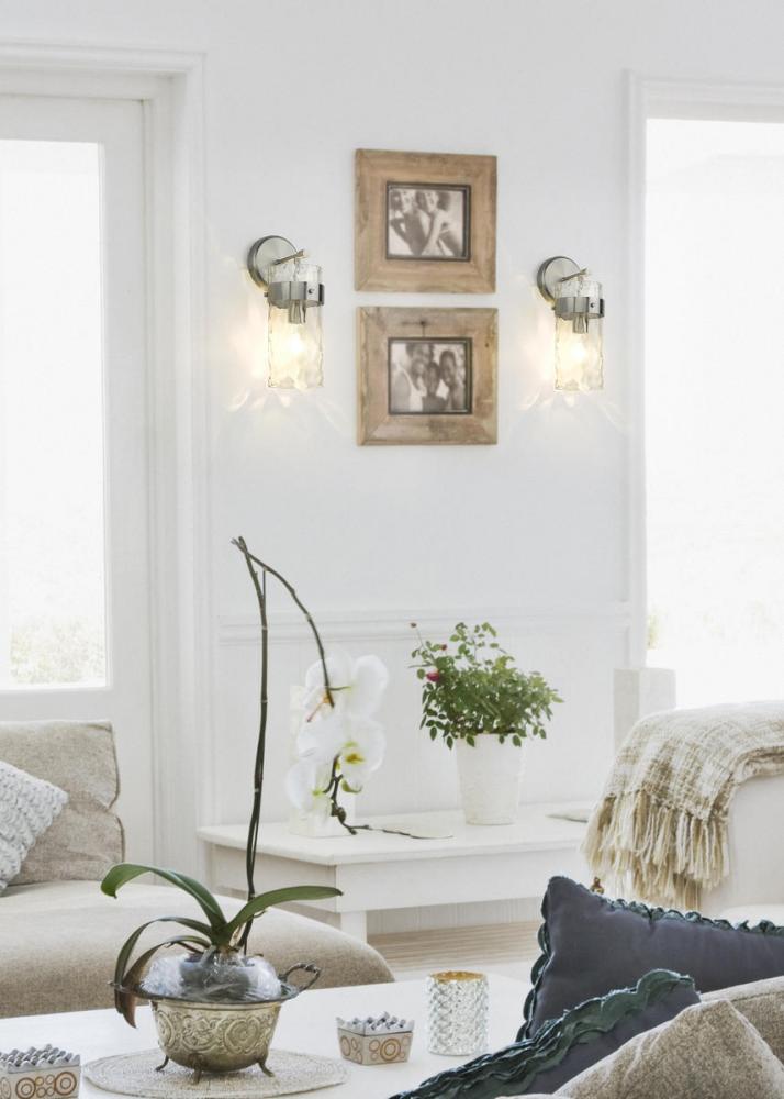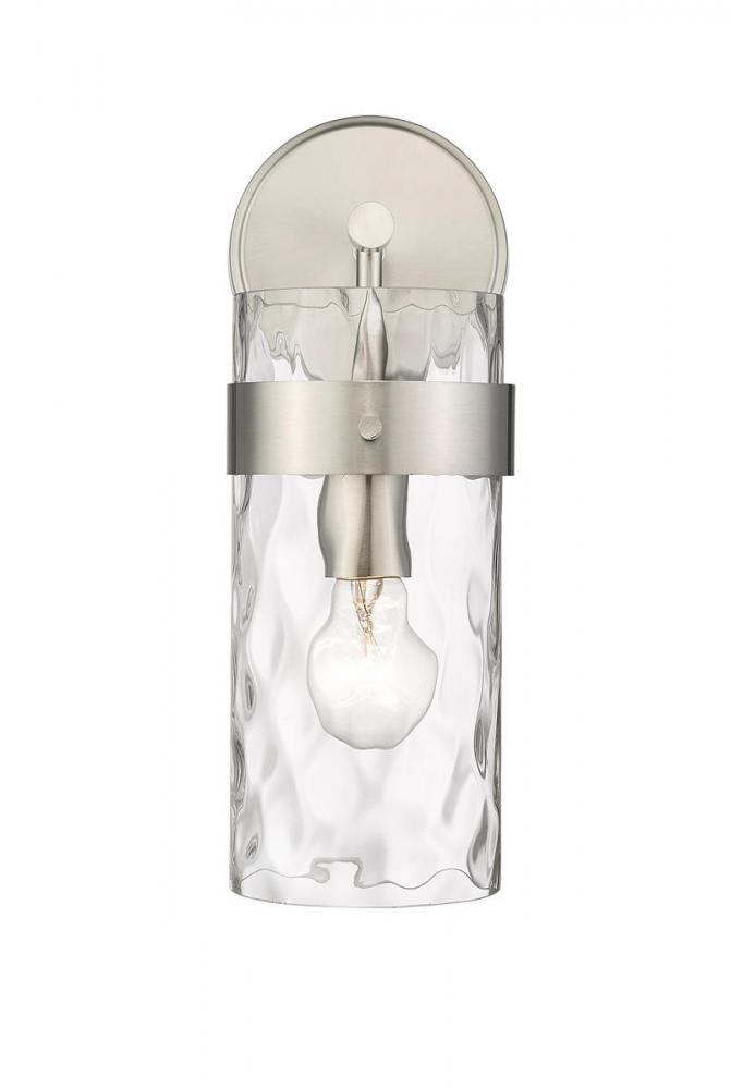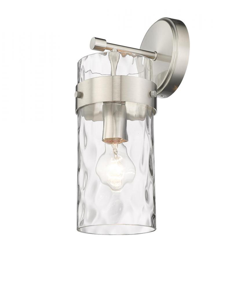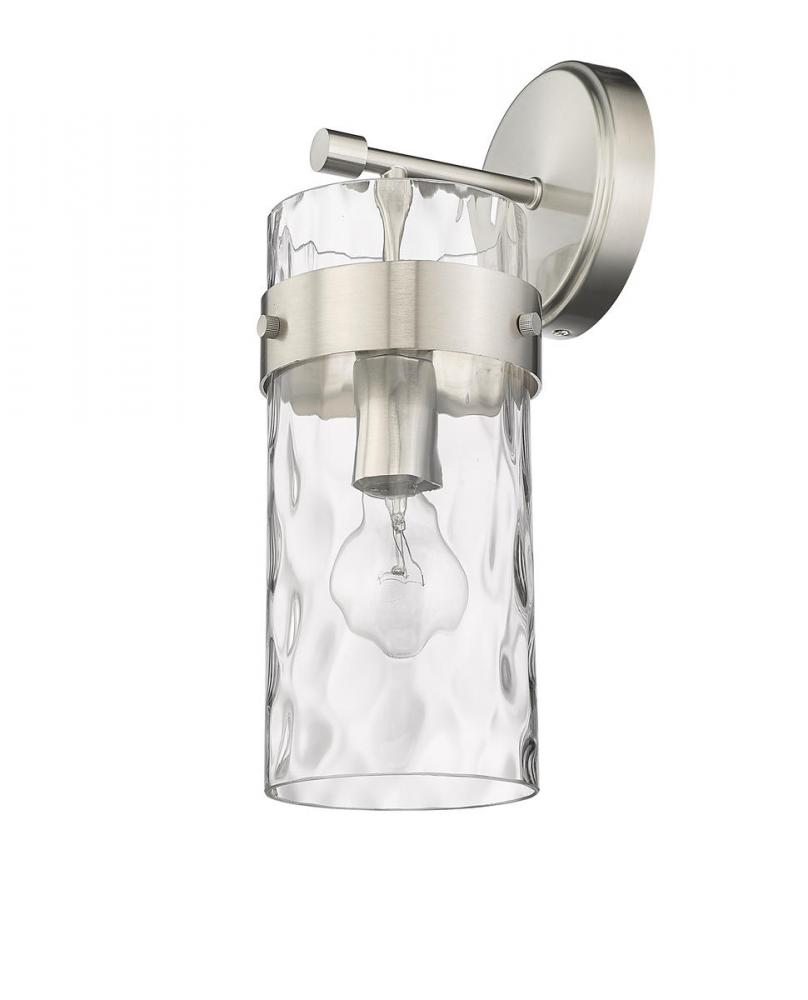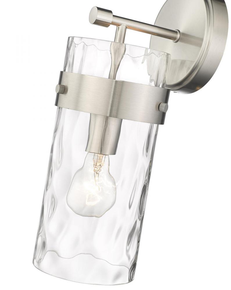 This wall sconce is designed to add a sense of modern elegance to any home. It is constructed from steel with a brushed nickel finish, while a cylinder glass shade in a ripple texture transforms the mood of the room.
