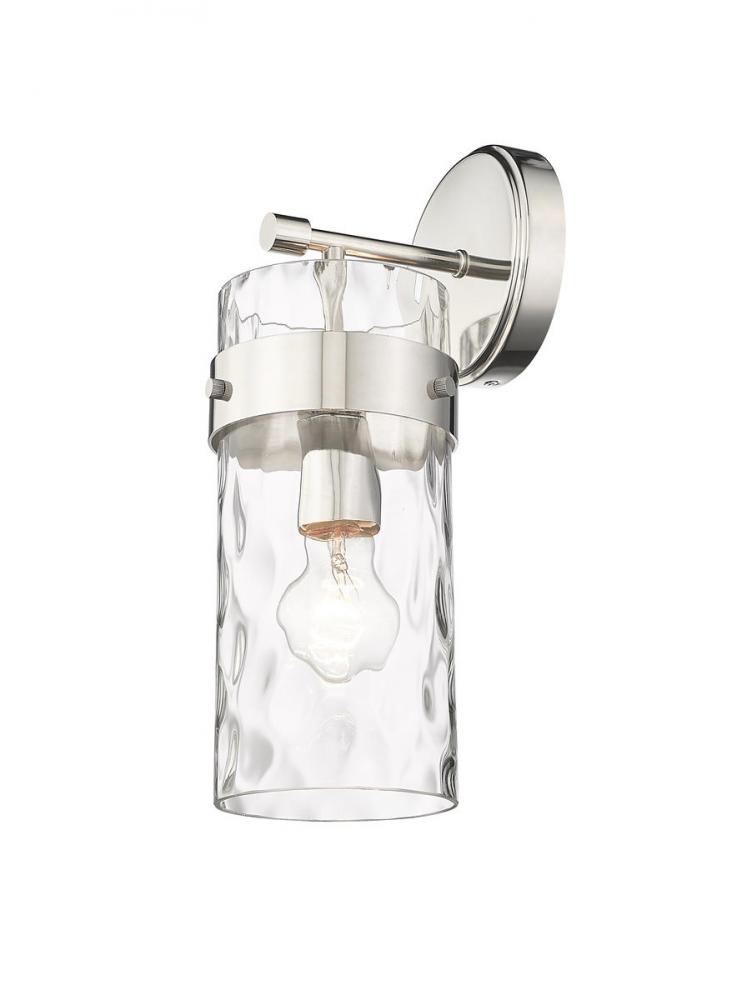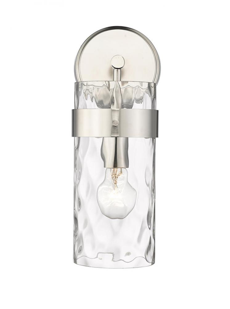 This wall sconce is designed to add a sense of modern elegance to any home. It is constructed from steel with a polished nickel finish, while a cylinder glass shade in a ripple texture transforms the mood of the room.
