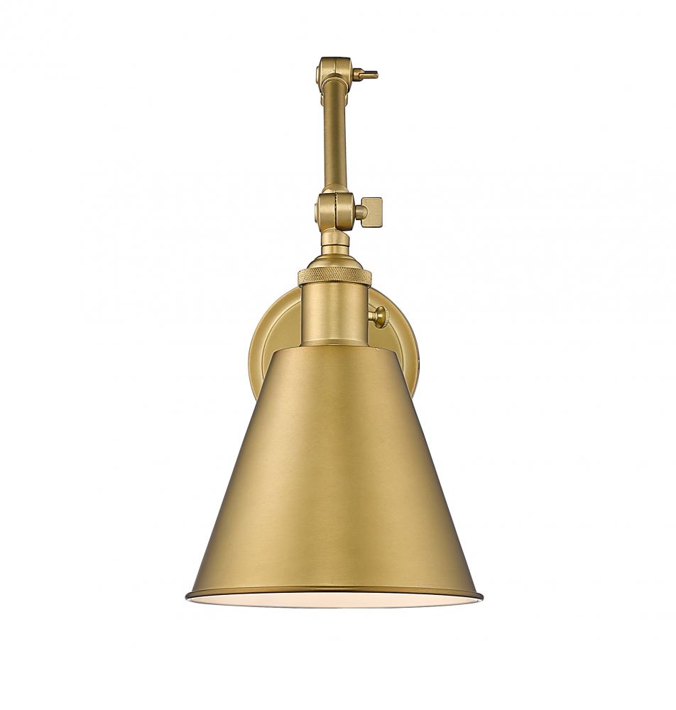 Mixed motifs offer an exquisite form of industrial style in a one-light wall sconce offering the perfect blend of glam and industrial design aesthetics. Constructed of warm rubbed brass finish steel framing and a matching steel conical shade, it delivers utility in an adjustable configuration making it easy to achieve customizable lighting levels. Install through hard-wiring or install cord-and-plug mounting to allow movement from space to space.