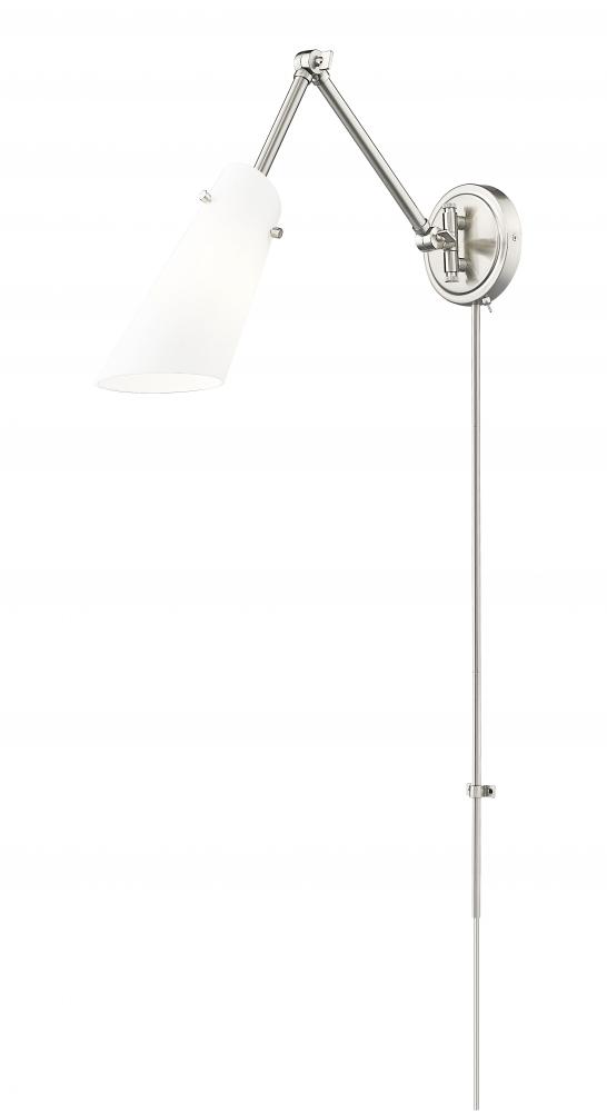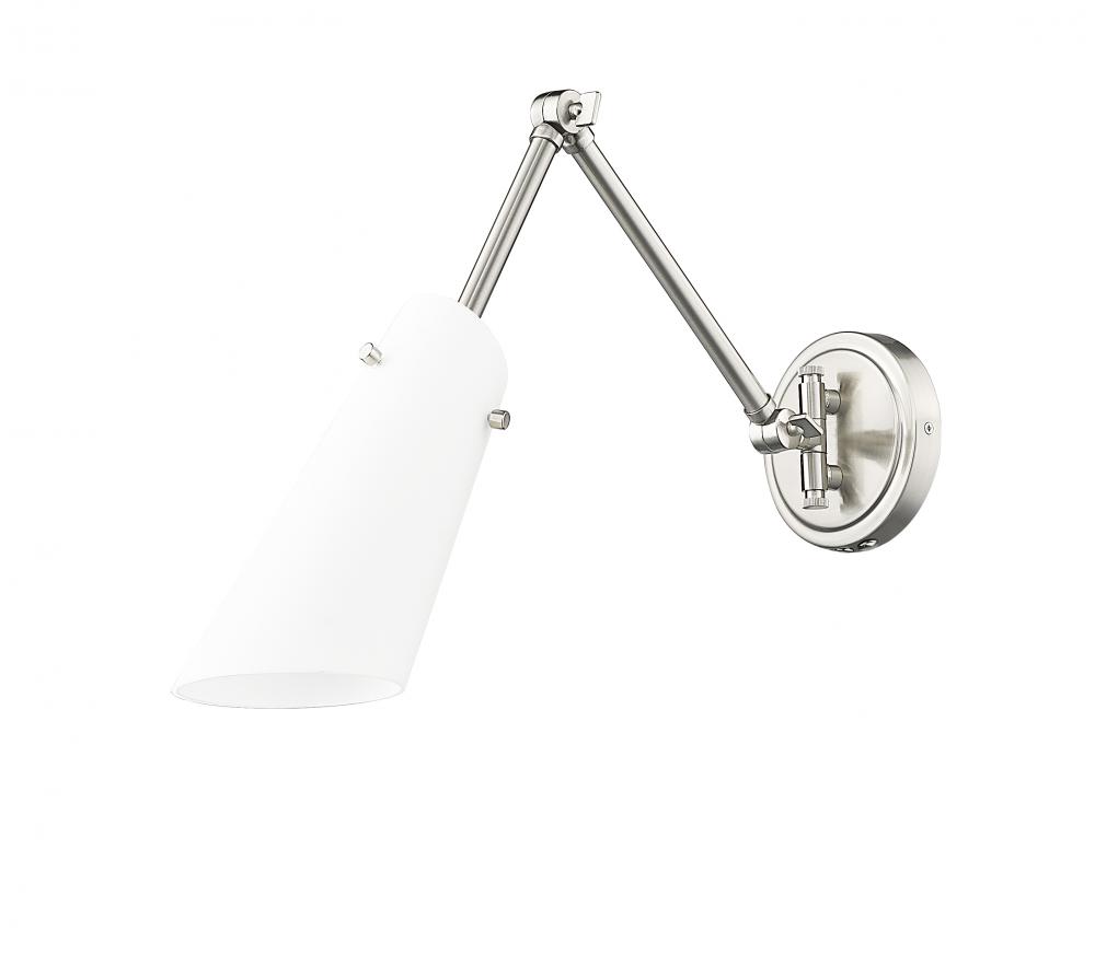 An articulating arm brings easy adjustability and maximum versatility to the contemporary profile of a modern one-light wall sconce. Its brushed nickel finish is bright and timeless, with an opal glass shade that delivers true, diffused illumination great for both tasks and ambiance. A perfect choice for a chic reading nook or bedroom. Install through hard-wiring or install cord-and-plug mounting to allow movement from space to space.