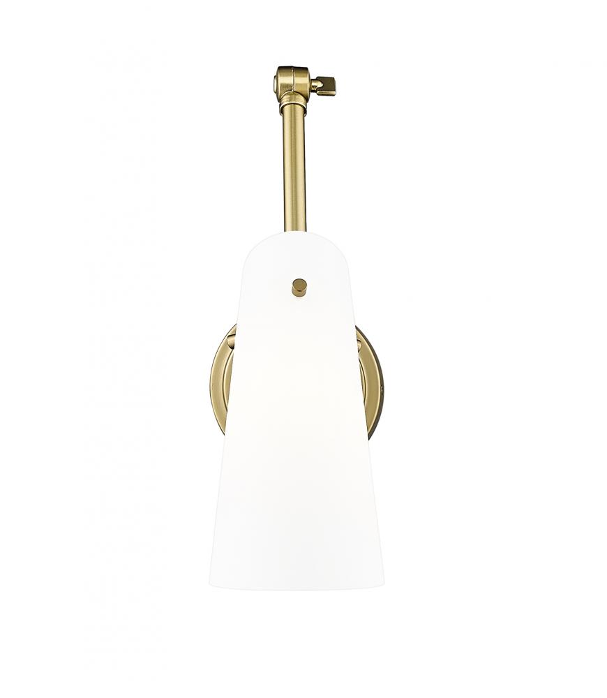 An articulating arm brings easy adjustability and maximum versatility to the contemporary profile of a modern one-light wall sconce. Its modern gold finish is bright and timeless, with an opal glass shade that delivers true, diffused illumination great for both tasks and ambiance. A perfect choice for a chic reading nook or bedroom. Install through hard-wiring or install cord-and-plug mounting to allow movement from space to space.