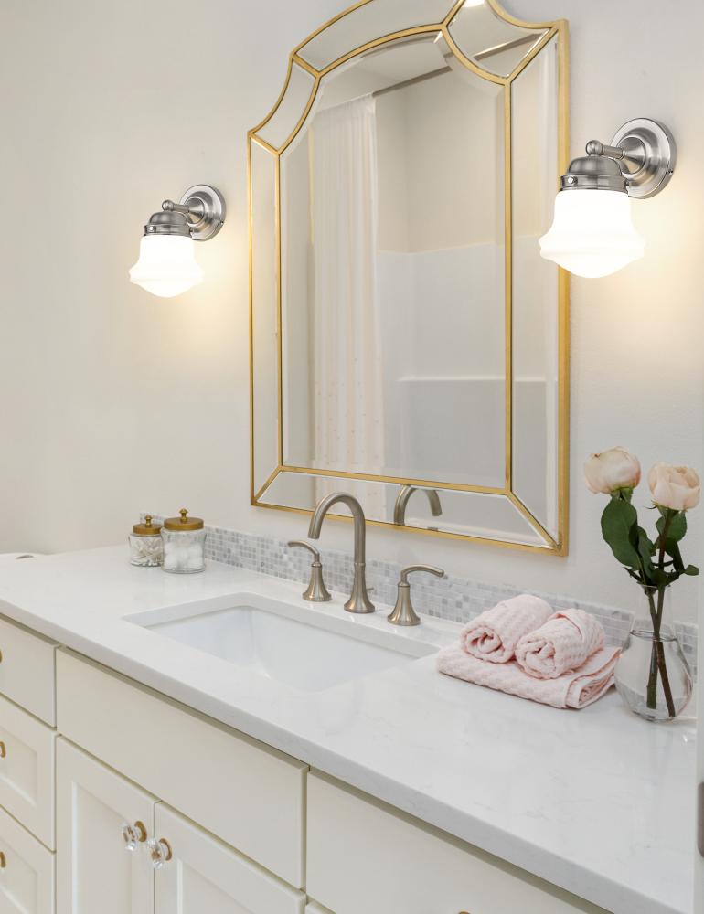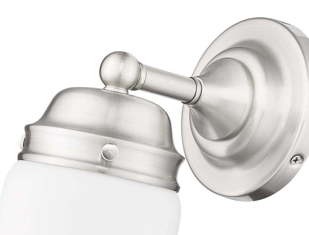 Vintage curves evoke schoolhouse glass in a Mid-Century inspired modern one-light wall sconce. A bright brushed nickel finish complements in a variety of bathrooms and living areas, with matte opal glass that creates soft, diffused illumination perfect for ambiance. A perfect choice flanking a vanity or freestanding tub.