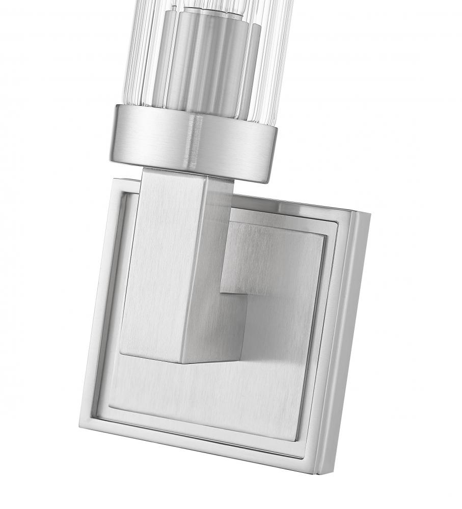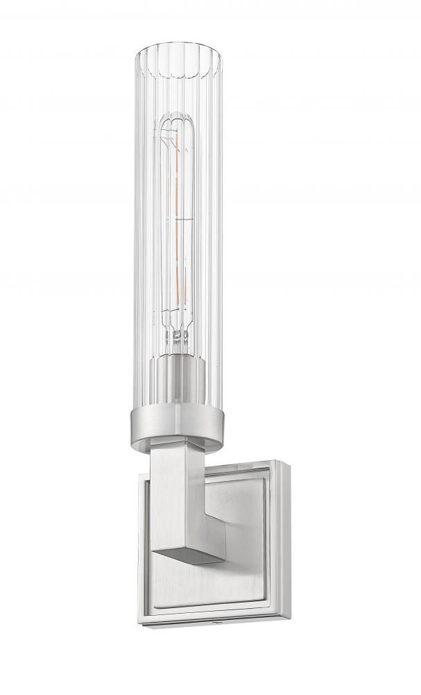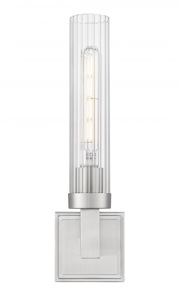 Gleaming brushed nickel finishing pairs with ribbed glass to bring depth and character to a modern one-light wall sconce. Perfect anywhere from entry to a powder room, it features a tall, stately silhouette with a decorative square wall plate. A tubular bulb adds vintage character, delivering impressive versatility.