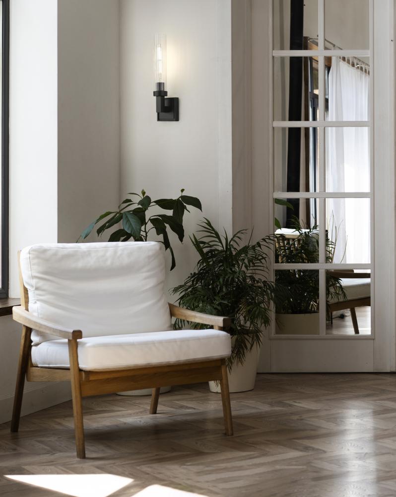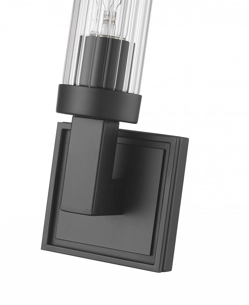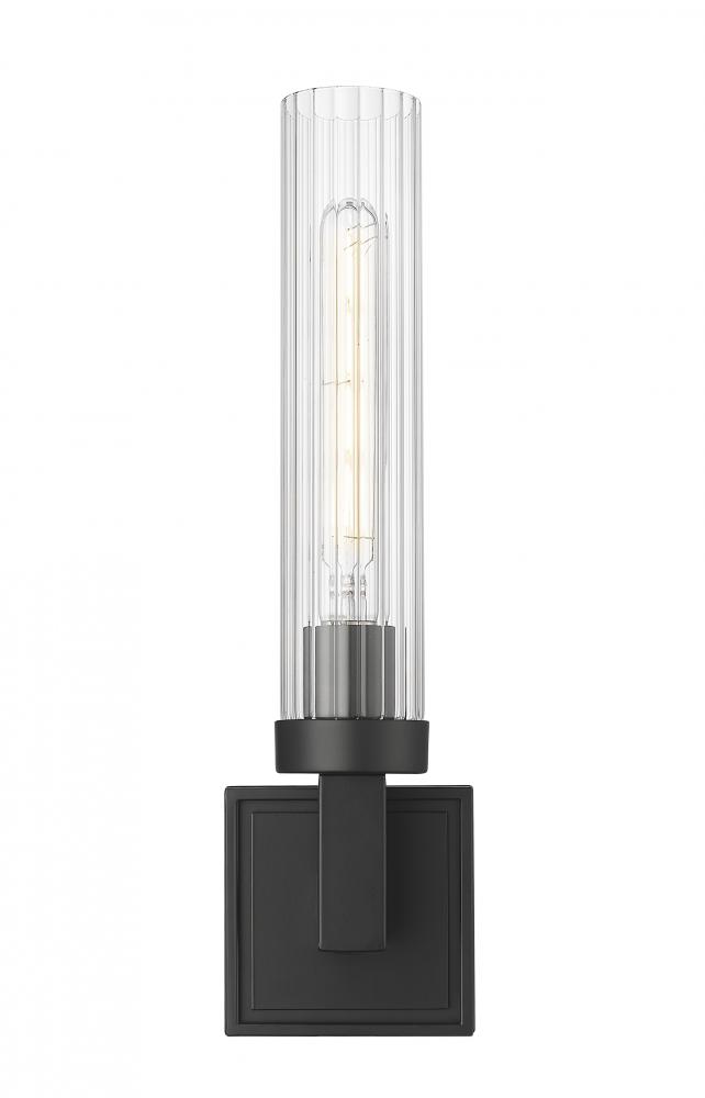 A clear tube of ribbed glass shades the light from this modern one-light wall sconce. Offering a rich, inviting glow, it boasts a square wall plate and a matte black finish over steel construction, creating bold contrast in any setting within your inviting home.