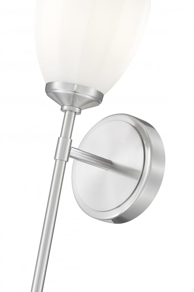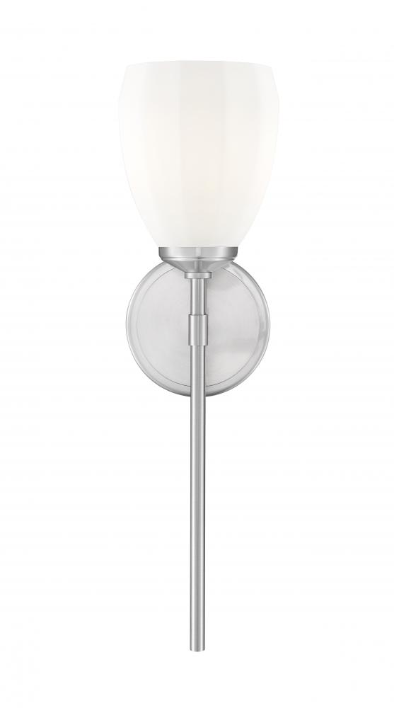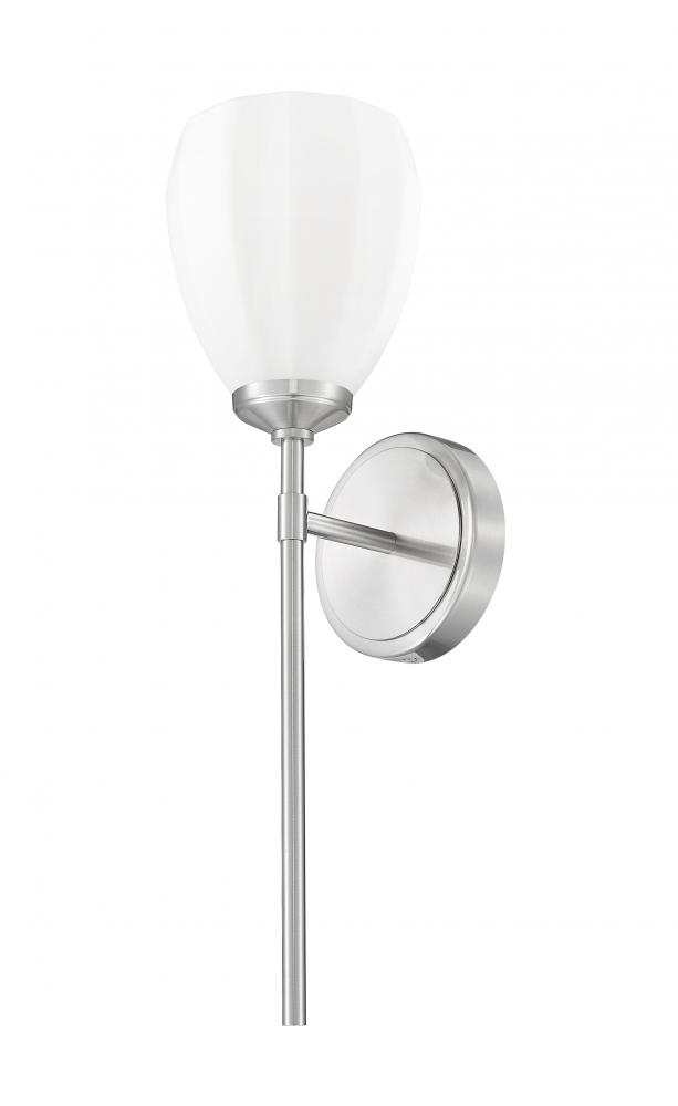 Delicate facets highlight the opal glass featured on this modern one-light wall sconce. Perfect for a bath or dressing area, it casts inviting uplighting and showcases a slim stem that creates the impression of a single beautiful flower. Graceful and feminine, this sconce is complete with an oval wall plate and a lovely brushed nickel finish.