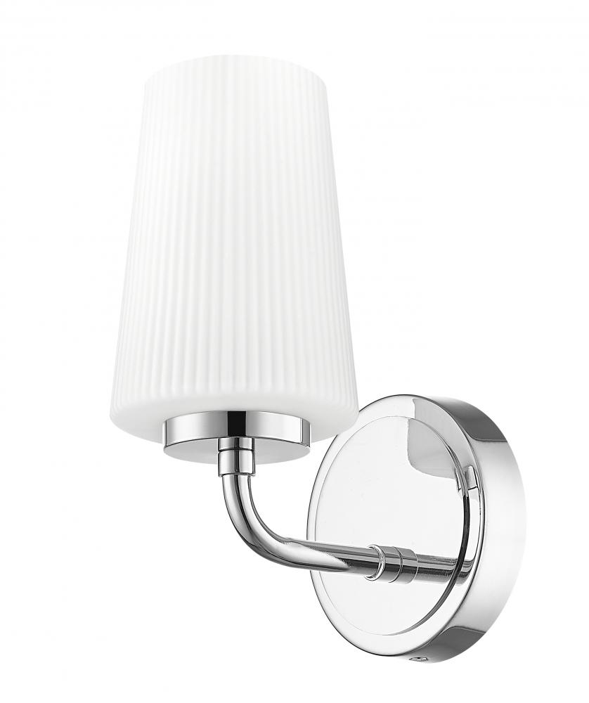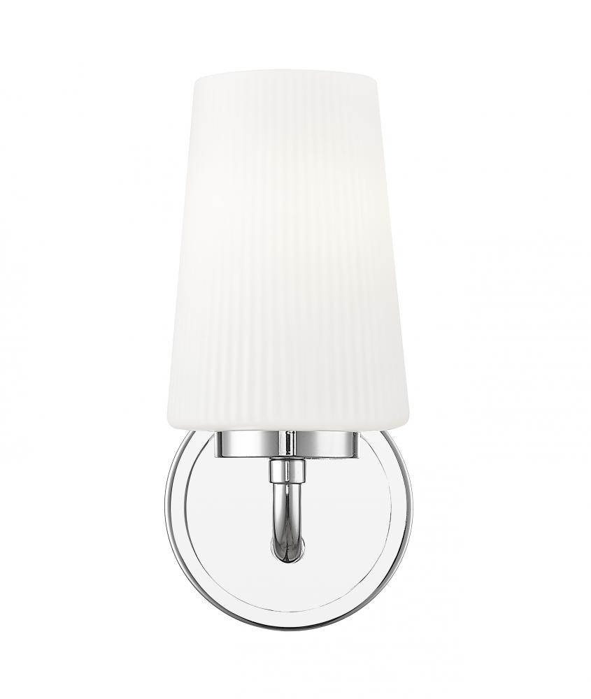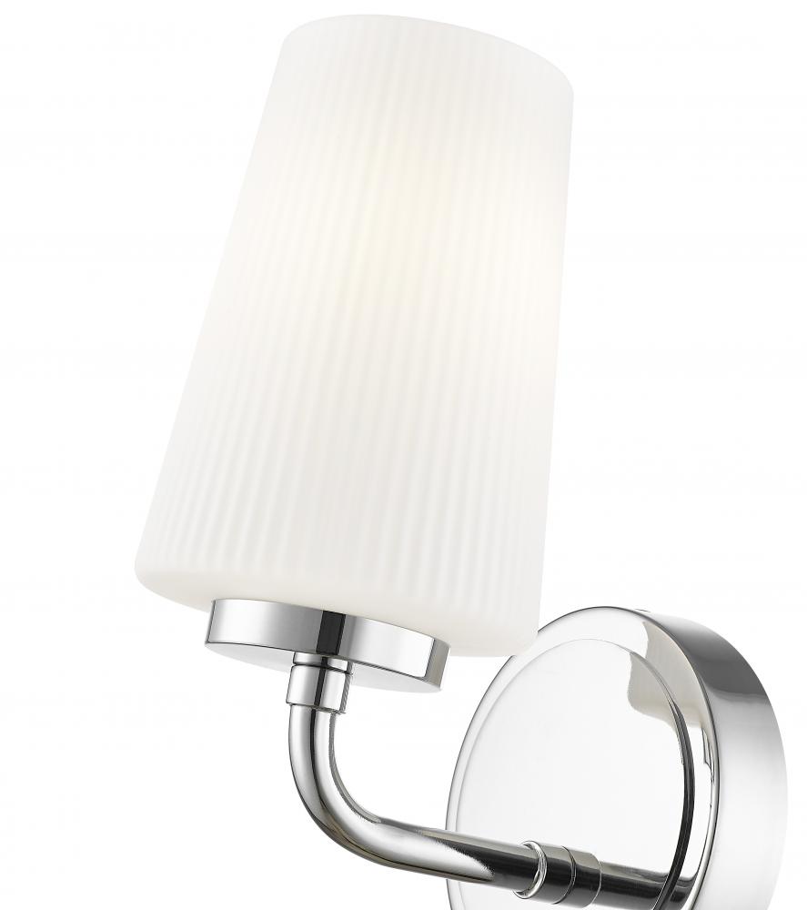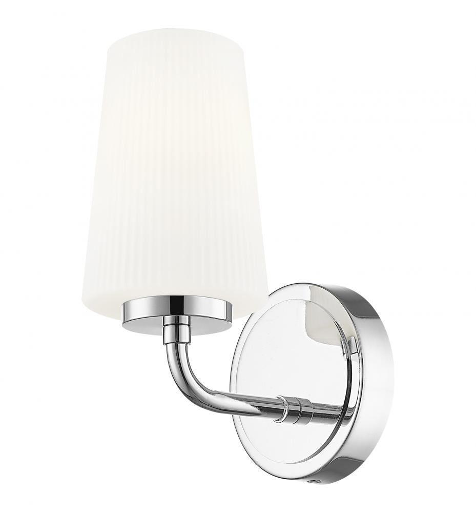 A bright chrome finish brings timeless but lively energy to this modern one-light wall sconce. Perfect for your bath or powder room, it showcases a slender silhouette with ribbed opal glass, creating soft, inviting illumination perfect for tasks and ambiance.