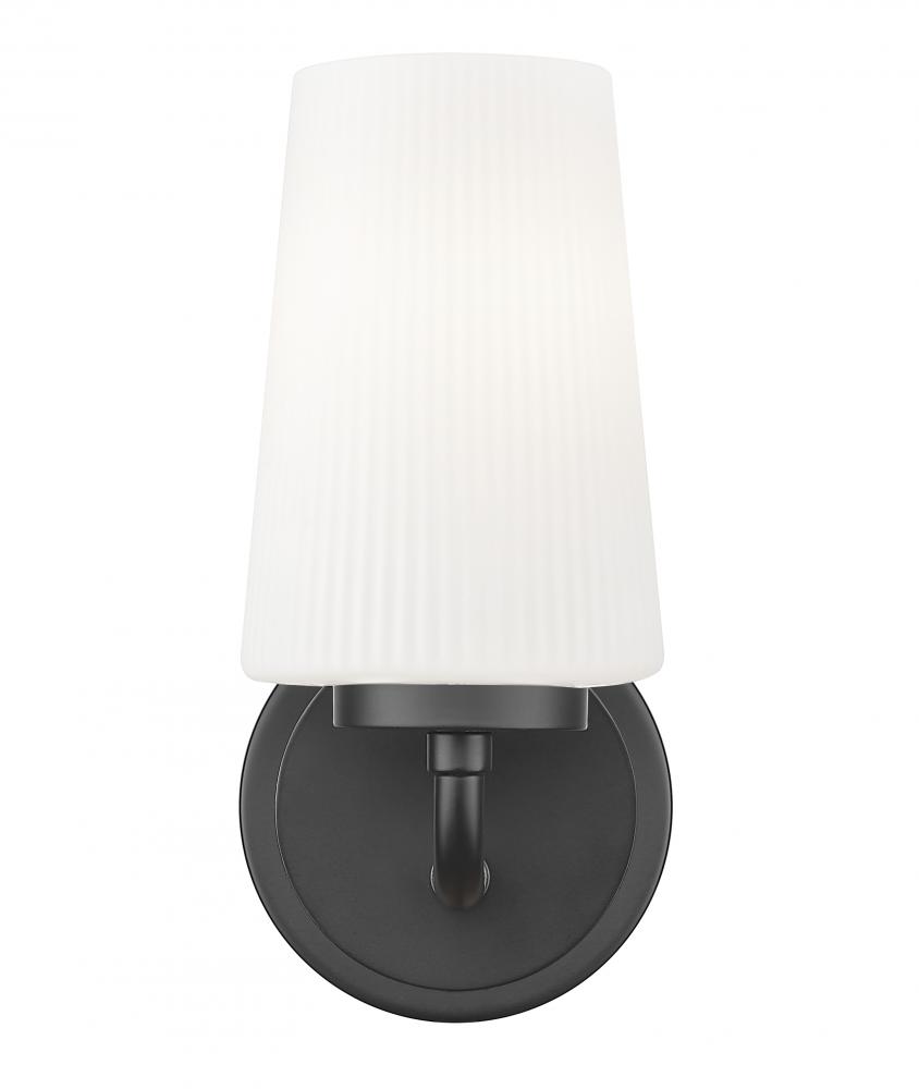 Classic black and white create a chic combination for this modern wall sconce for the bath or powder room. Its slim, simple silhouette is augmented with a finely ribbed opal glass shade, ensuring soft, diffused illumination. Its simply charming alone or in pairs flanking a vanity.