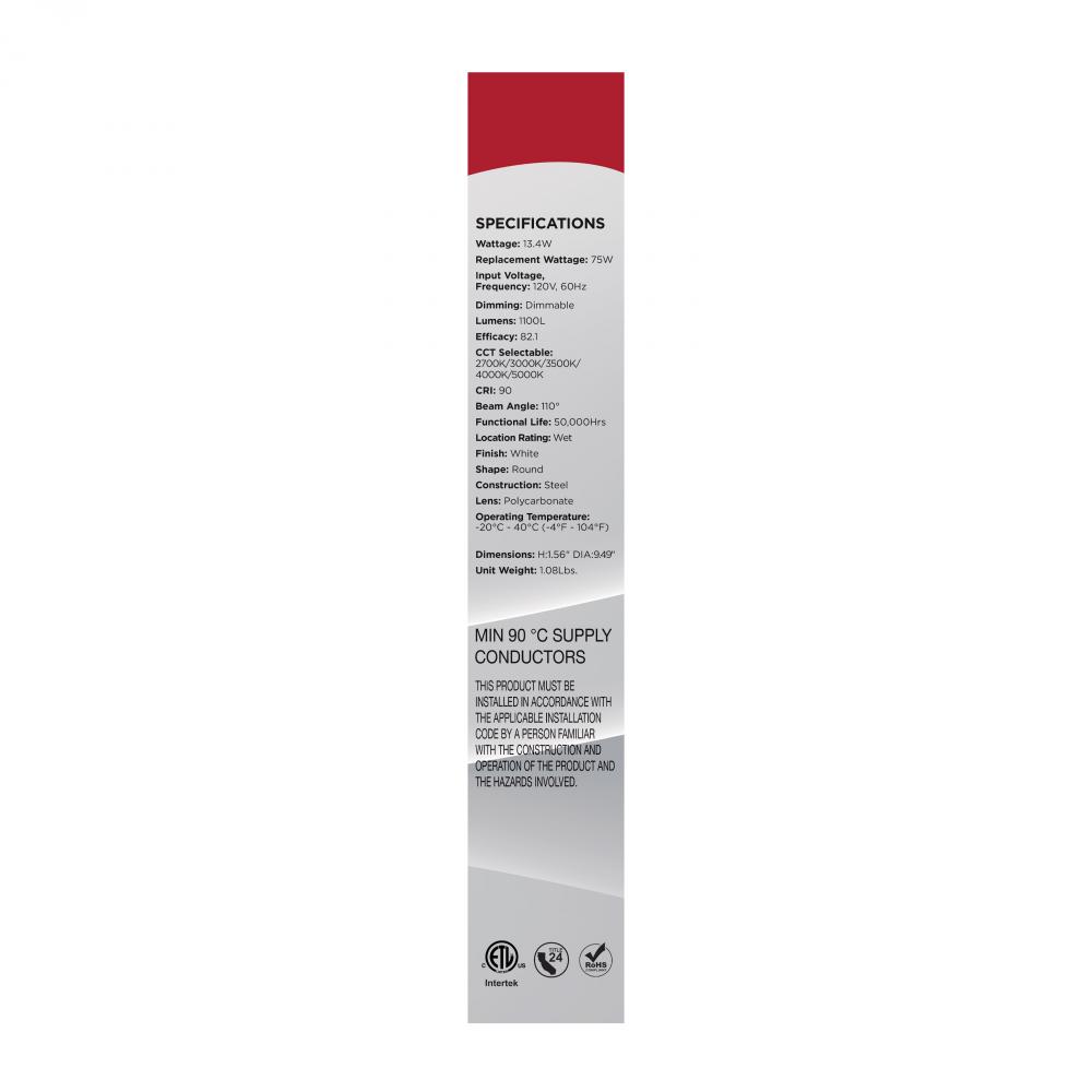 10 Inch LED Disk Light; 27K/3K/35K/4K/5K CCT Selectable; White Finish