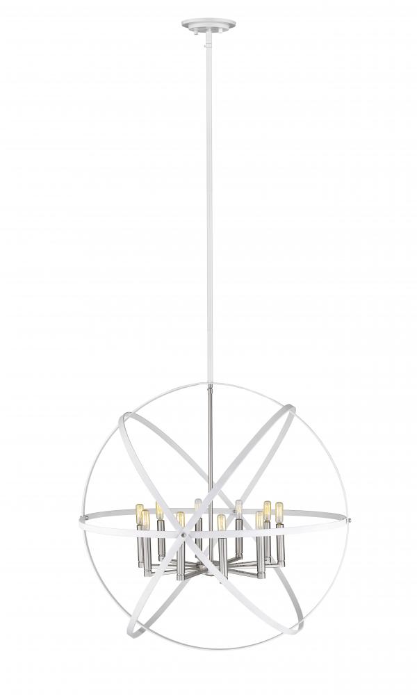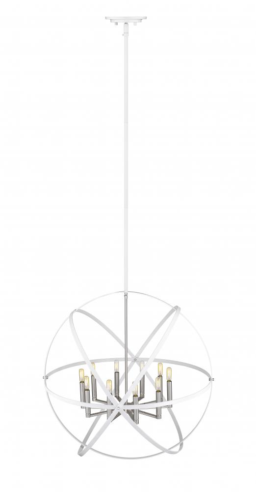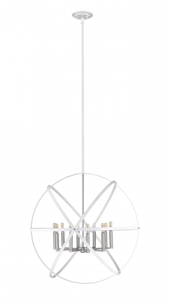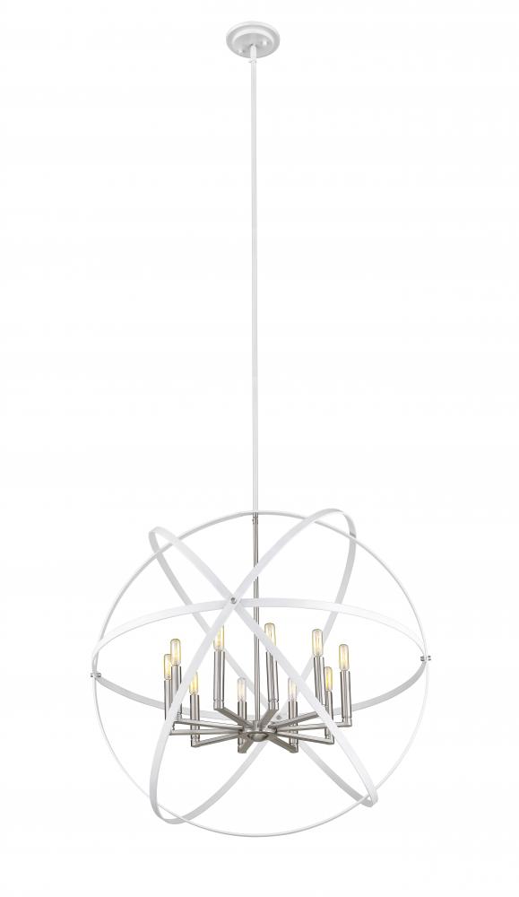 Set a stylish scene with the open spherical design of this hanging pendant light. Charmingly bright, rings of hammered white couple with inner rods in a brushed nickel finish to impress.