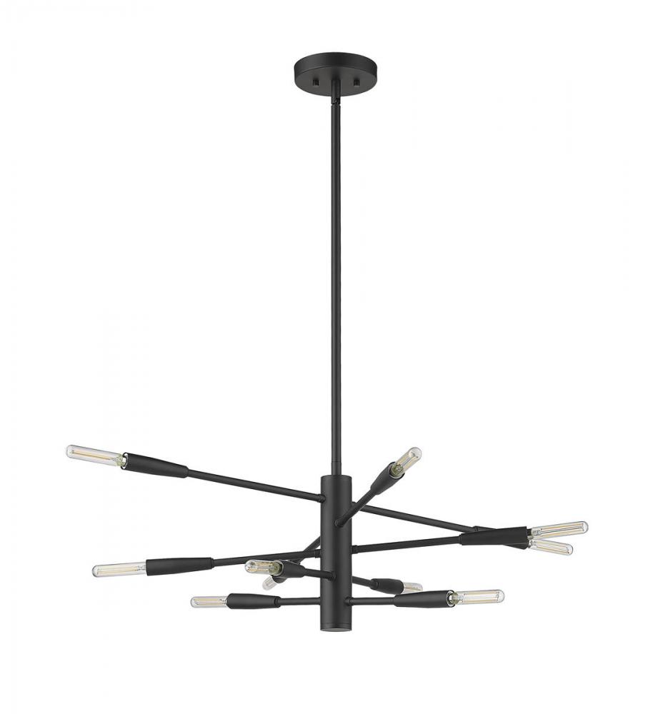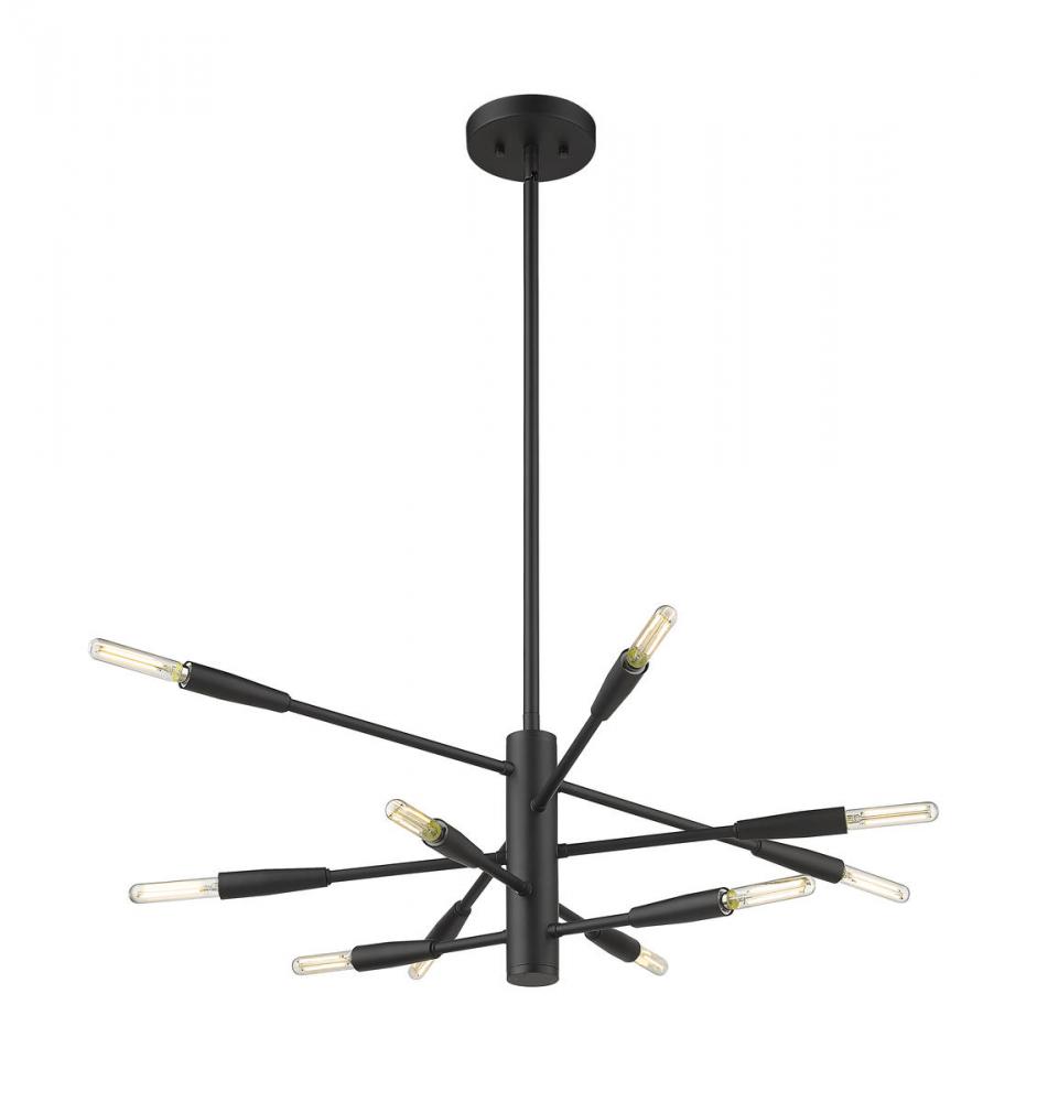 Bring the visual impact of a space-inspired fixture to any contemporary space, adding this dynamic ten-light chandelier to a modern dining room or living area. The sleek look of bold matte black finish steel shapes a linear frame and canopy with slender adjustable arms angled to create an abstract silhouette. This light from the Ascension collection captures attention when mounted on a straight or sloped ceiling.