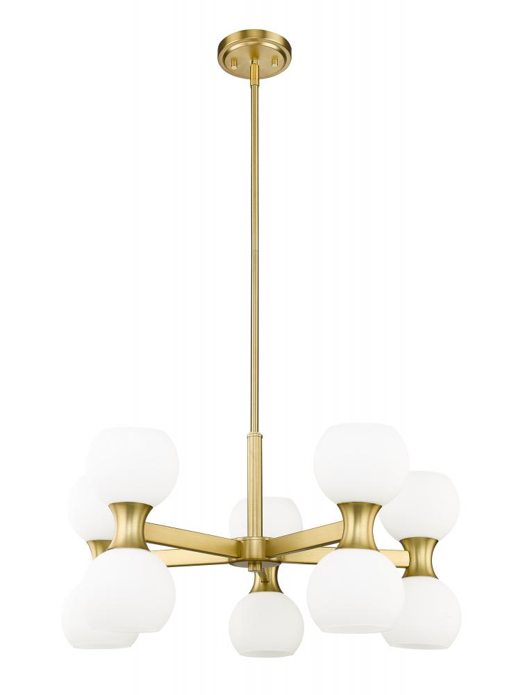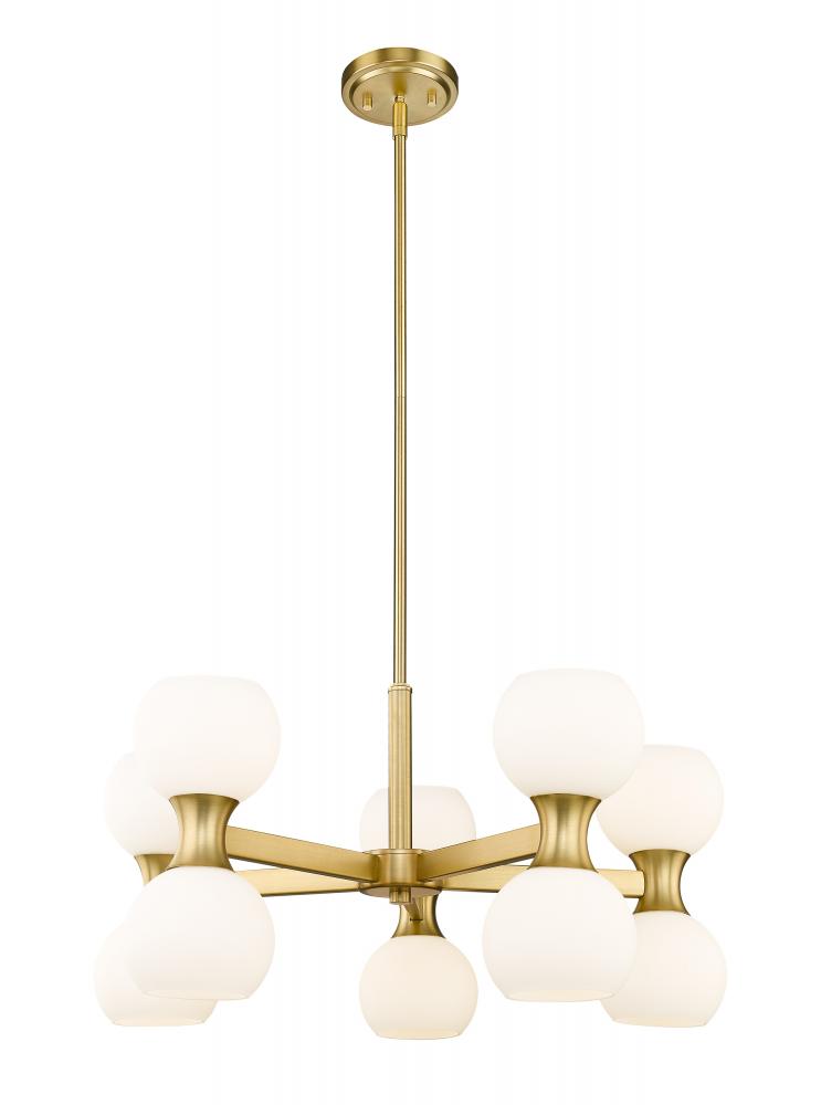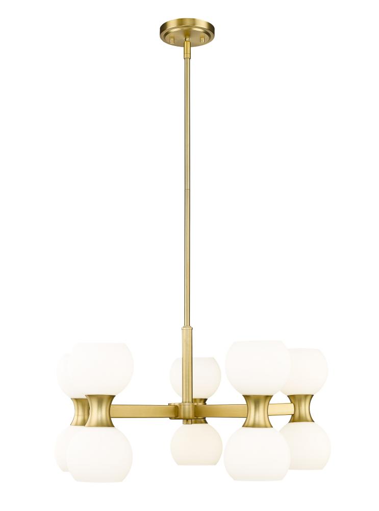 Lush modern gold finish steel begins a decadent journey toward a reworked Mid-Century Modern motif in a 10-light chandelier from the Artemis collection. Perfectly blending linear elements with chic concave shapes, this transitional fixture illuminates a dining space, living room, or entryway with delicate opal glass shades and adds a pop of attitude.