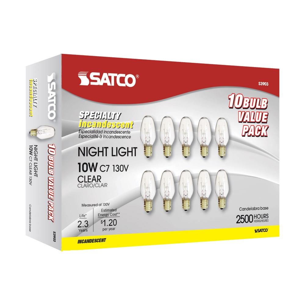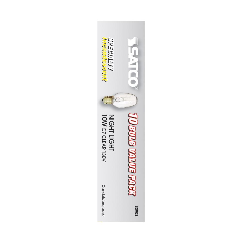 10 Watt C7 Incandescent; Clear; 2500 Average rated hours; 60 Lumens; Candelabra base; 130 Volt