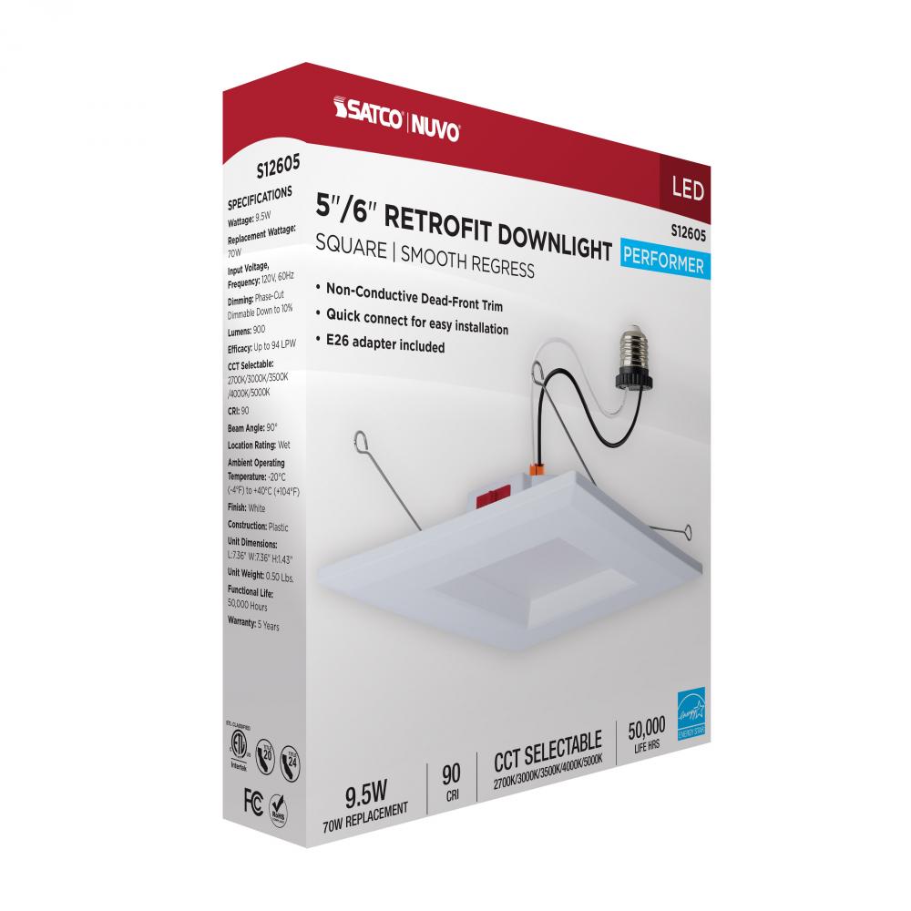 SATCO NUVO's S12605 5/6-inch square, 9.5W, Performer Series LED Retrofit Downlight combines effortless installation with a sleek, functional design. Its smooth regress baffle minimizes glare, while the integrated on-unit switch allows easy selection fr
