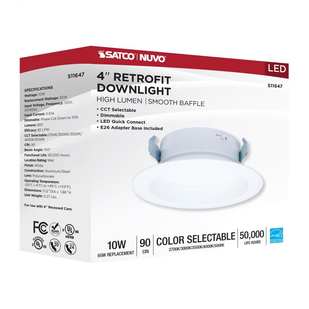 SATCO NUVO's LED CCT Selectable 4 inch High Lumen Retrofit Downlight, S11647, will elevate the lighting in any space. Designed with impeccable 90 CRI color rendering, you can make your space brighter while saving energy with this 1,100 high lumen LED d