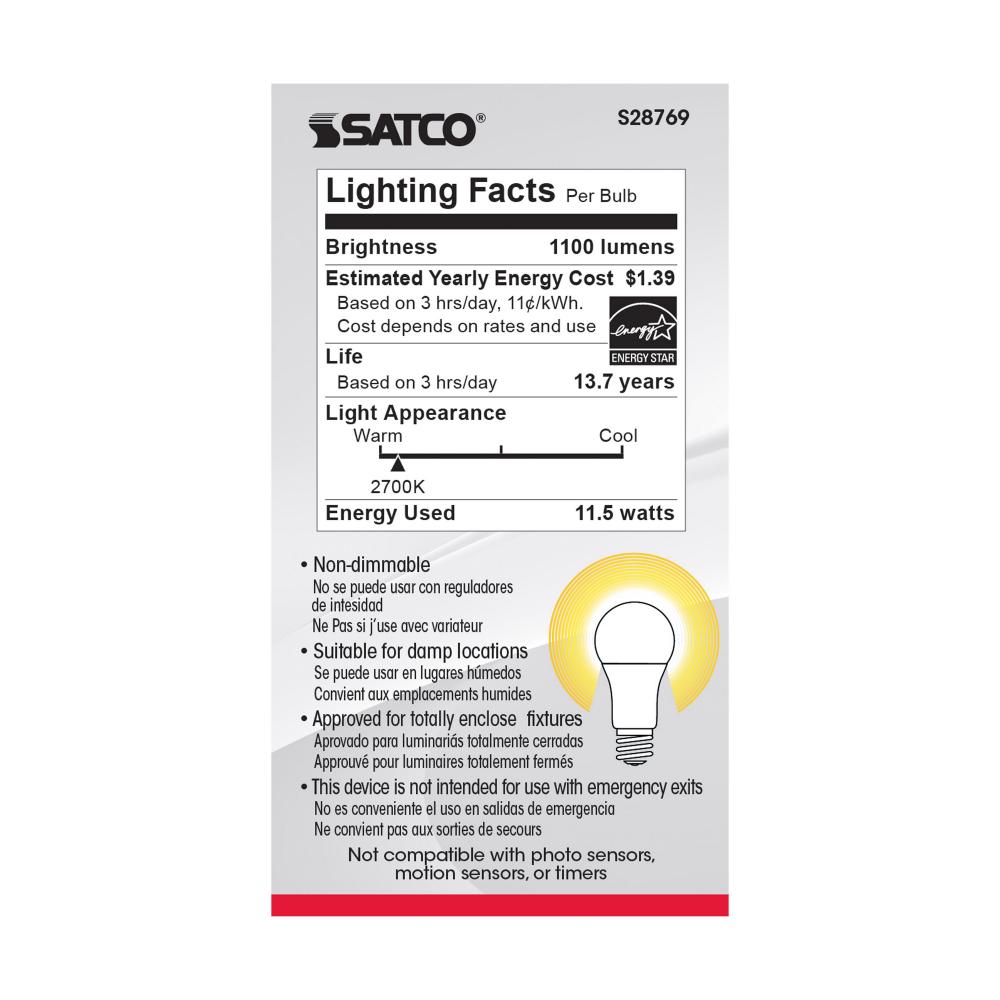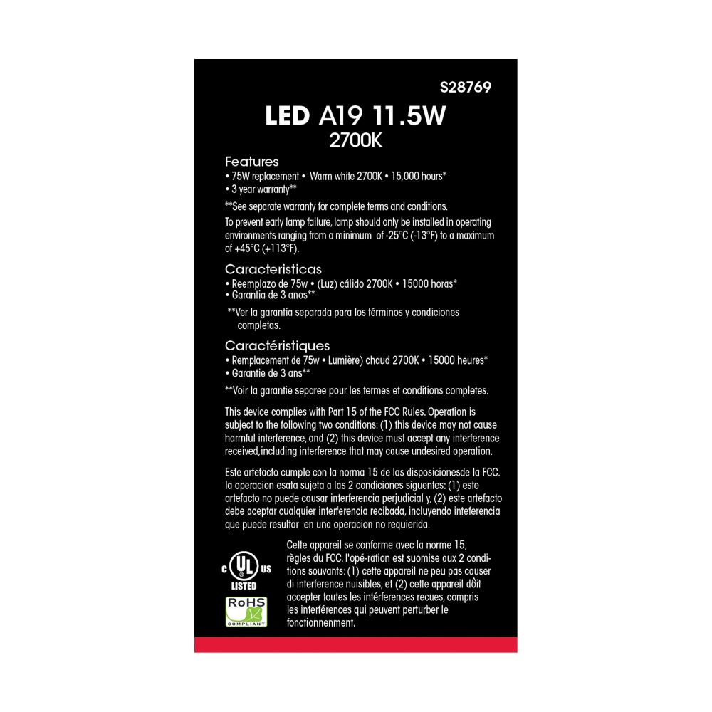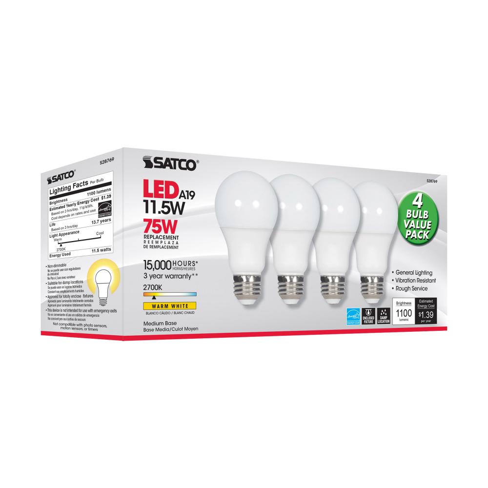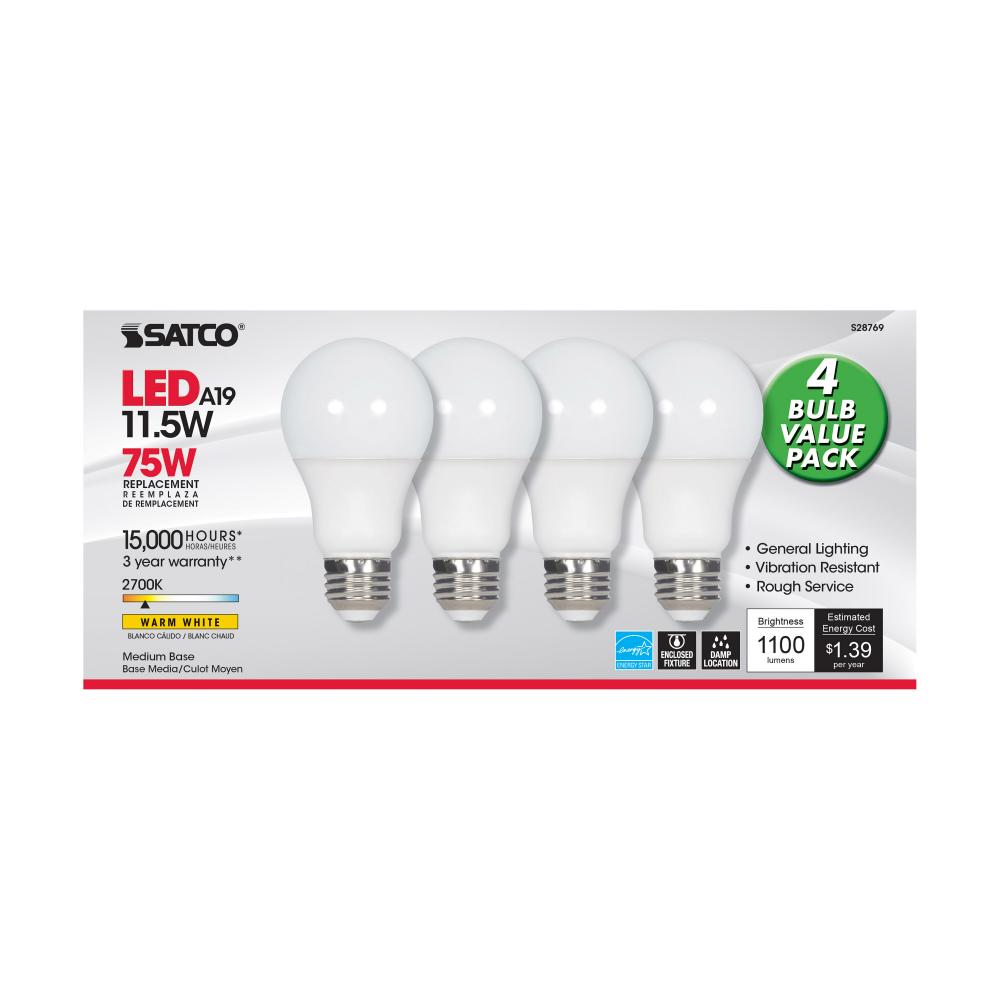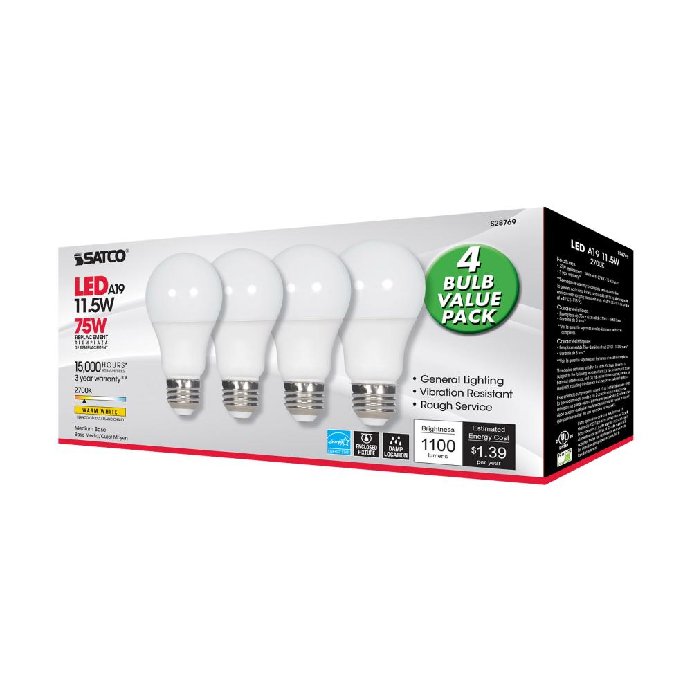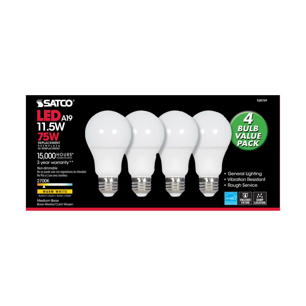 11.5 Watt; A19 LED; 2700K; Medium base; 220 deg. Beam Angle;120 Volt; 4-pack