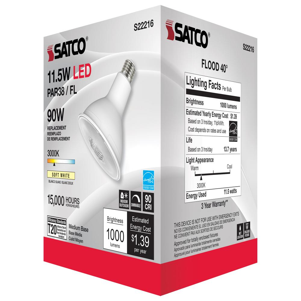 Satco's 11.5-watt PAR38 LED is an energy efficient lighting solution for residential and commercial applications. This versatile lamp is designed for use in both track and recessed fixtures. This dimmable bulb can be used both indoors and outdoors and