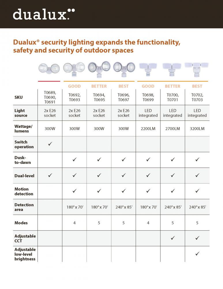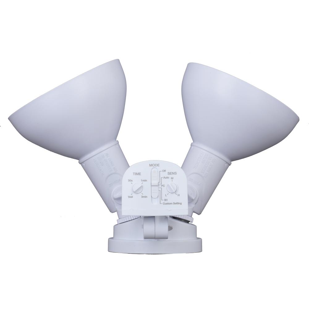 This 2-light outdoor motion sensor security light provides low-level approximately 30% ambient lighting throughout the night and bright 100% high level when motion is detected. The light heads and sensor are fully adjustable to keep your home’s exterior brighter at dusk, dimmer at night, and instantly bright when motion is detected. Customize your lighting options with 5 modes of operation plus adjustable motion sensor sensitivity. Suitable for wall or eave mounting with a wide detection area of 180 degrees and 70 feet. This Dualux security flood light expands the functionality, safety, and security of your home’s outdoor spaces with bright, reliable light when and where it is needed most.