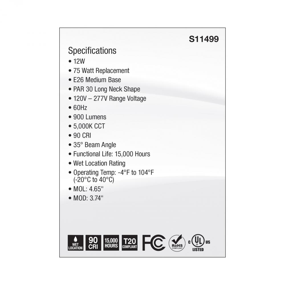 SATCO NUVO's S11499 PAR30 Long Neck Range Voltage lamp is designed for application in 120V-277V fixtures. With crisp, 90 CRI light output in 5000K, this is an ideal lamp for residential commercial, hospitality, general lighting, recessed downlighting a