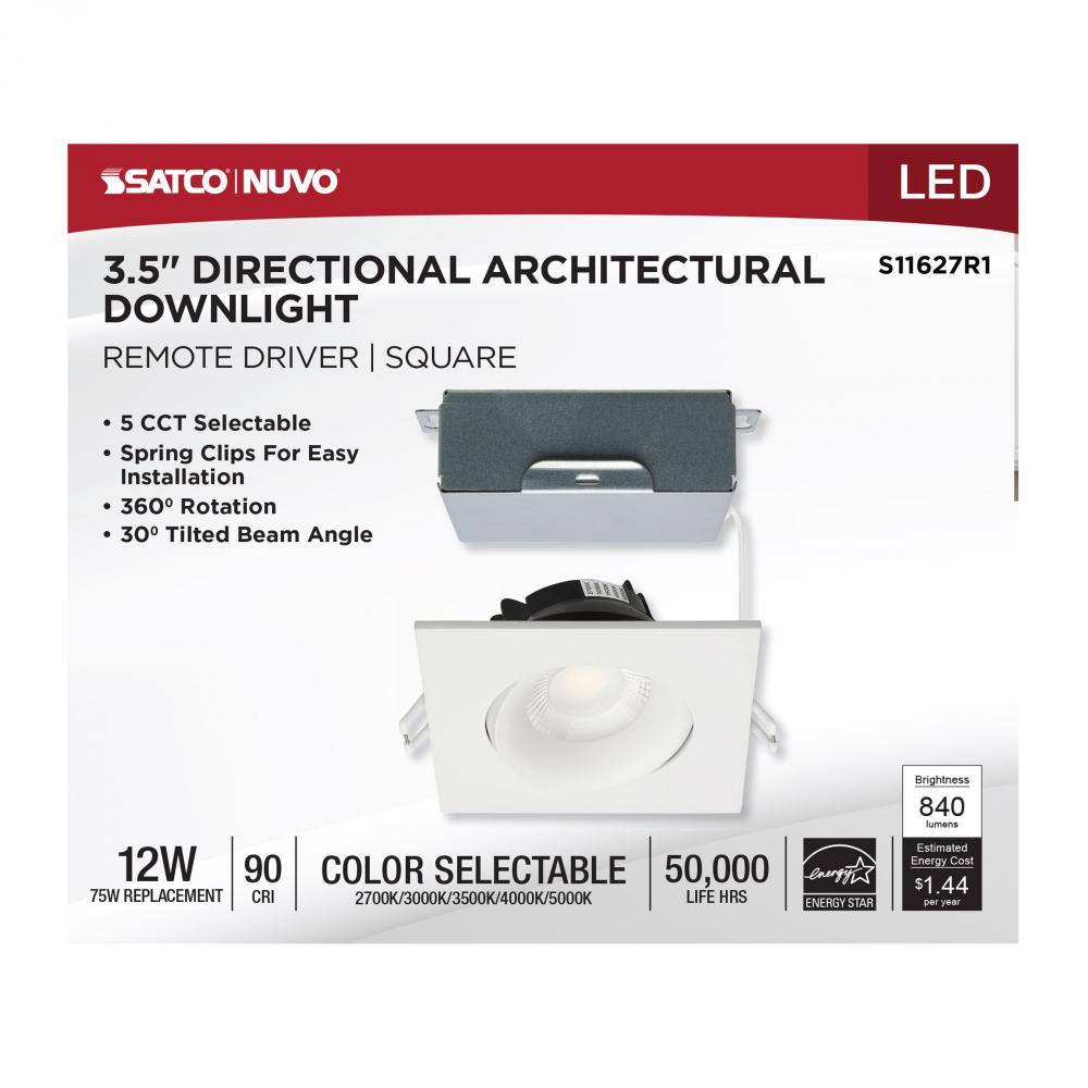 12 Watt LED Direct Wire Downlight; Gimbaled; 3.5 Inch; CCT Selectable; Square; Remote Driver; White