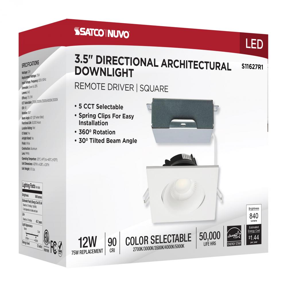 12 Watt LED Direct Wire Downlight; Gimbaled; 3.5 Inch; CCT Selectable; Square; Remote Driver; White Finish; 840 Lumens; 120 Volt