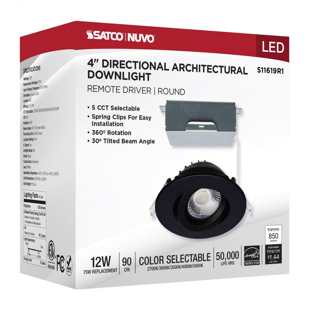 12 Watt LED Direct Wire Downlight; Gimbaled; 4 Inch; CCT Selectable; Round; Remote Driver; Black