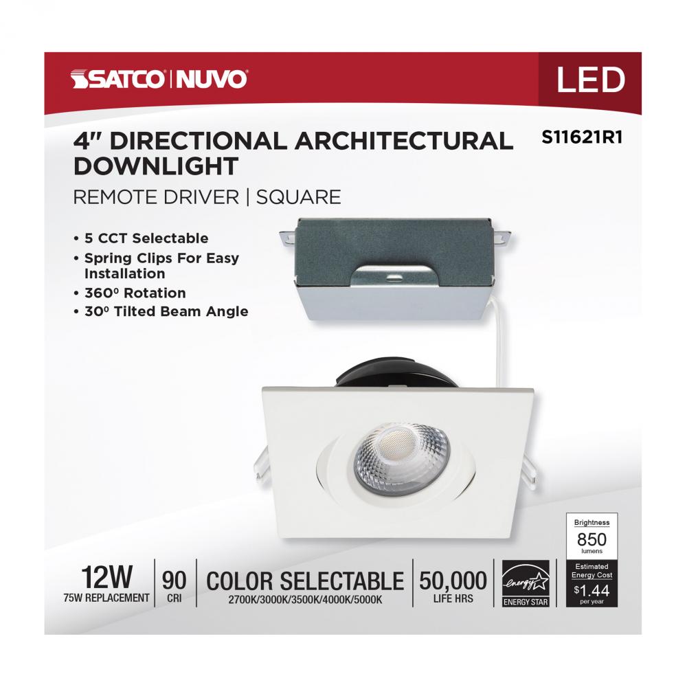 12 Watt LED Direct Wire Downlight; Gimbaled; 4 Inch; CCT Selectable; Square; Remote Driver; White