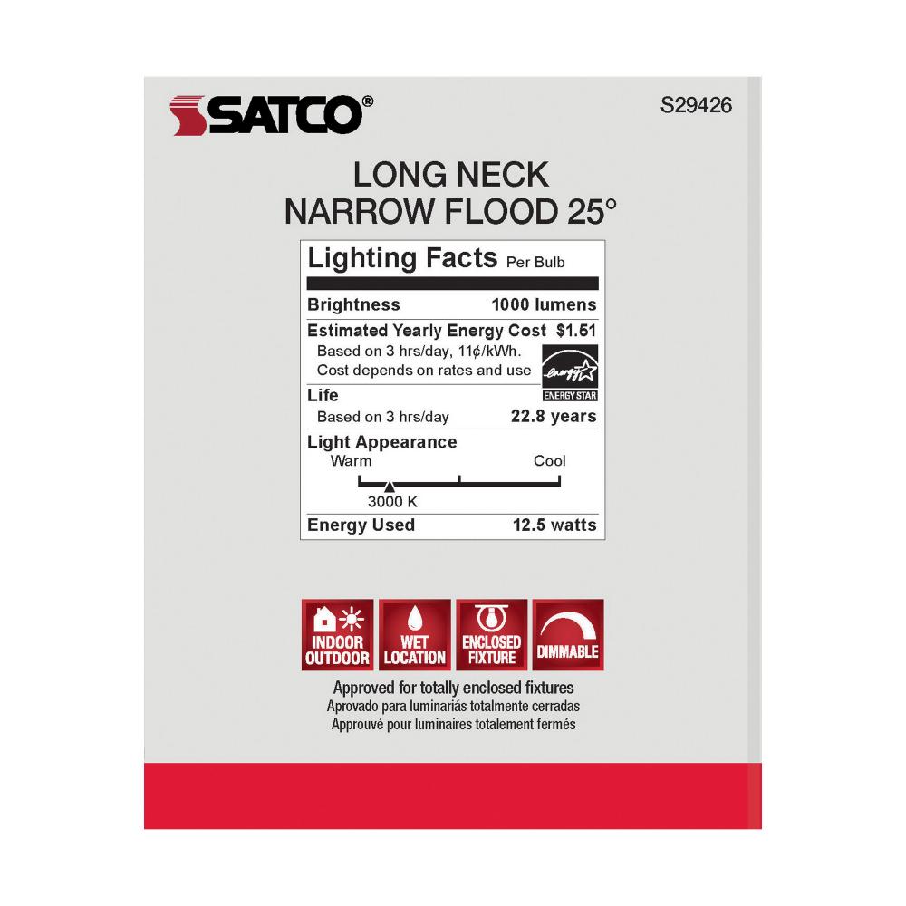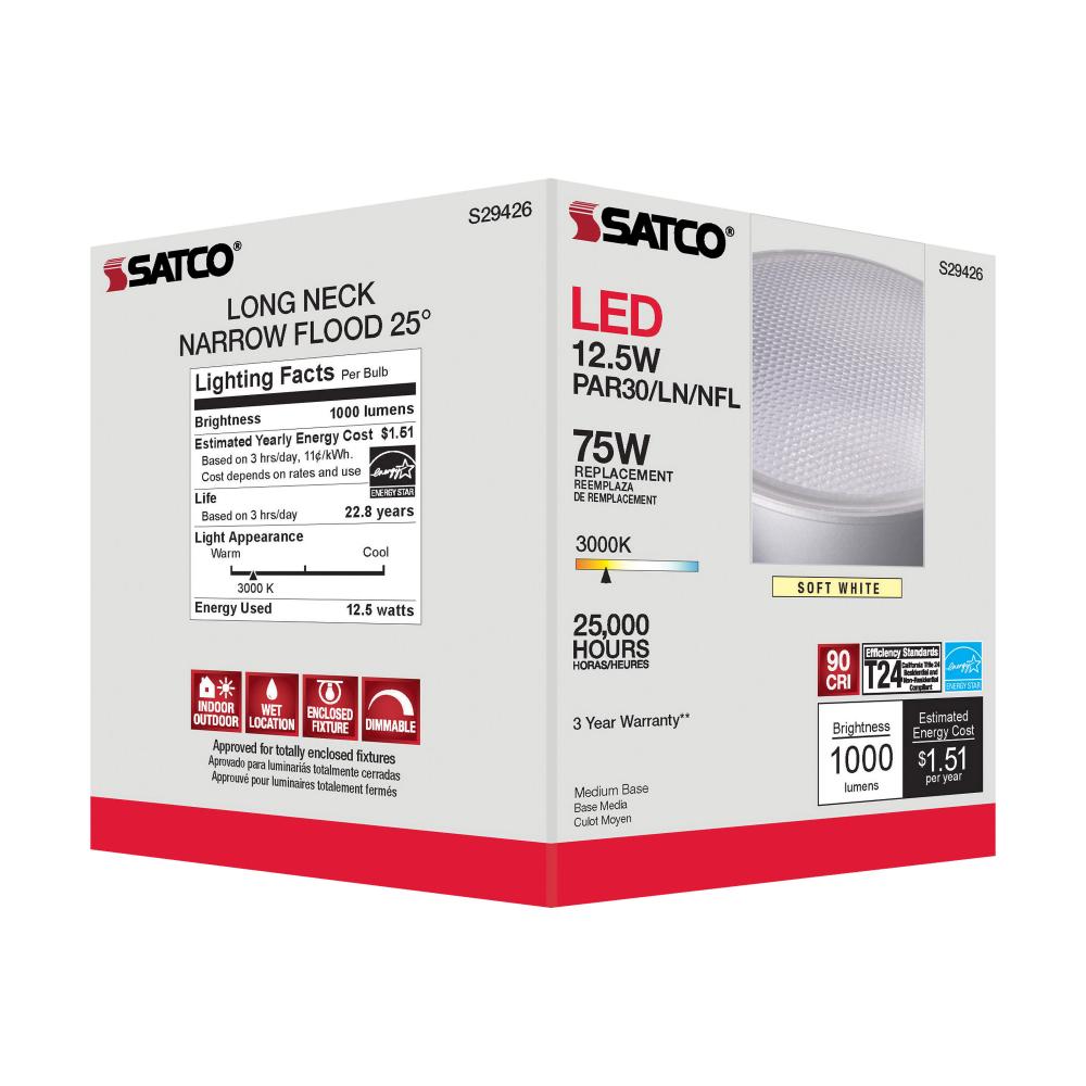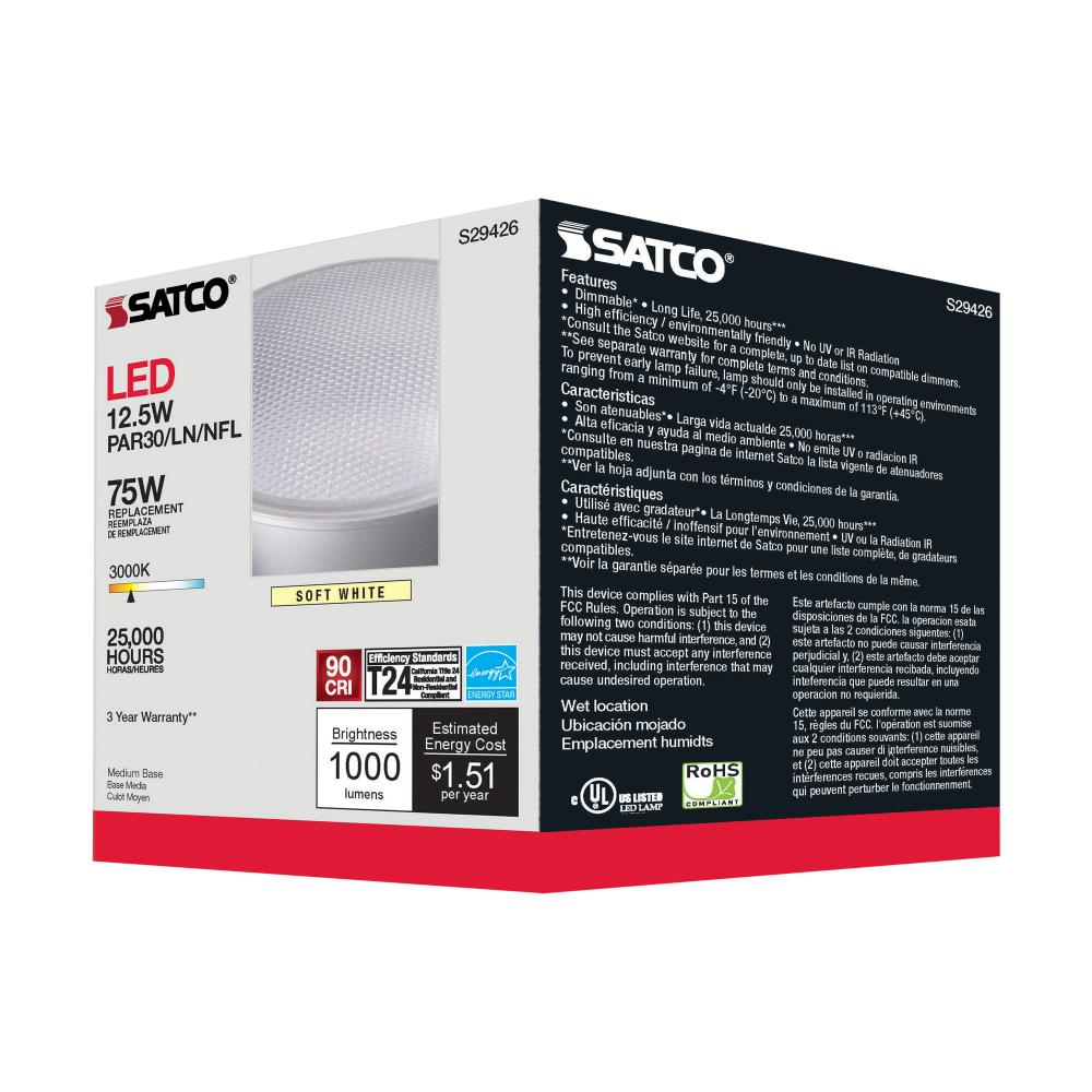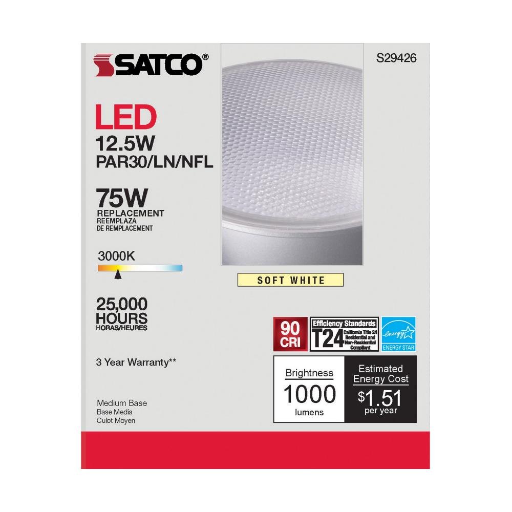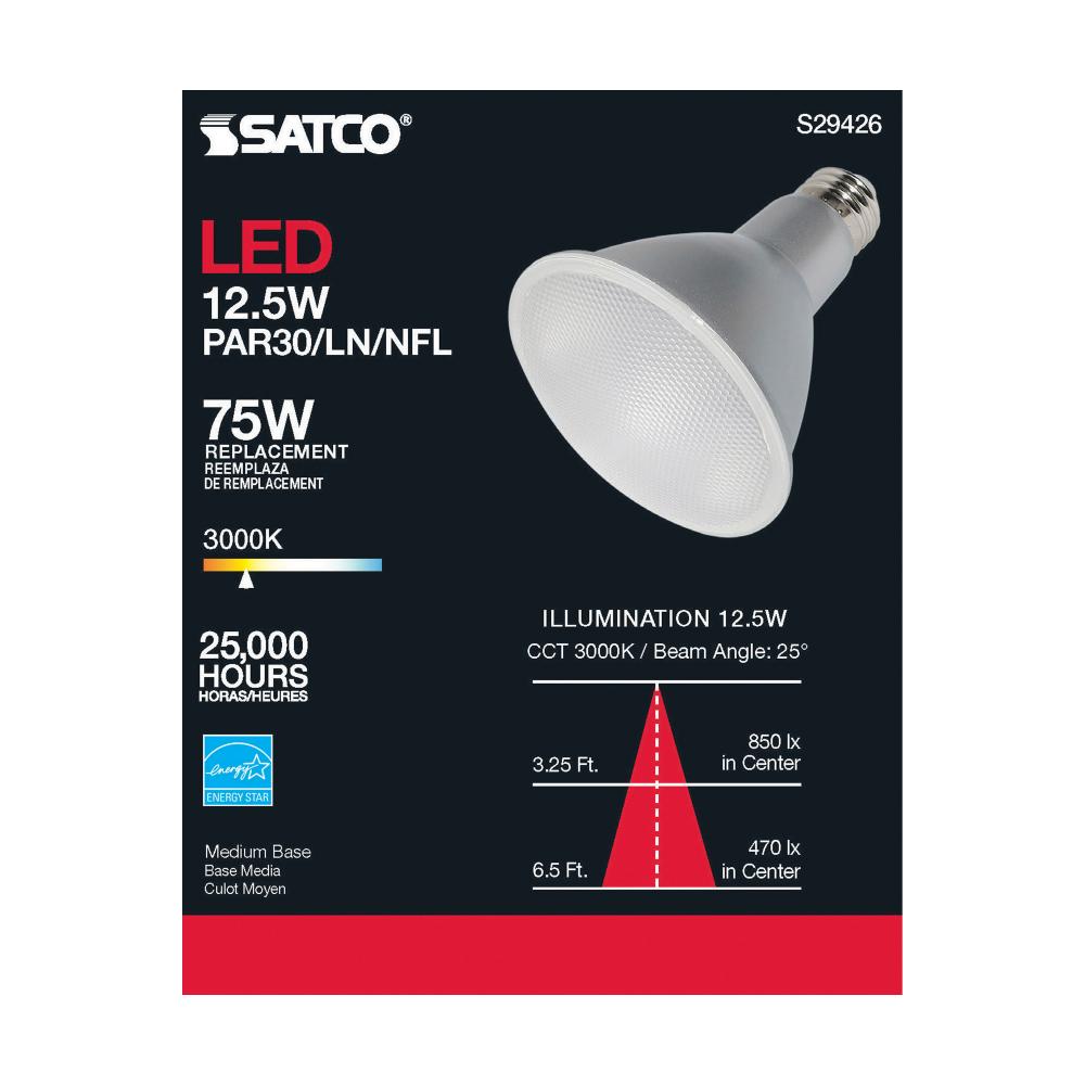 Satco's S29426 LED 12.5-watt, PAR30LN lamp maintains the familiar look of the Halogen PAR and Gen1 LED lamps they replace; but at 90 CRI and a higher lumens per watt ratio, it delivers superior light and improved efficiency. Designed for use in track,