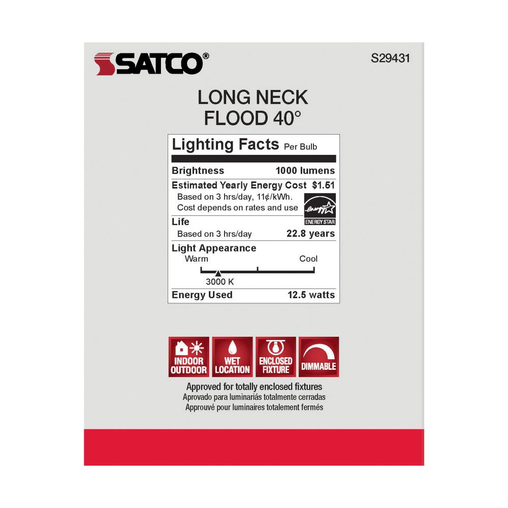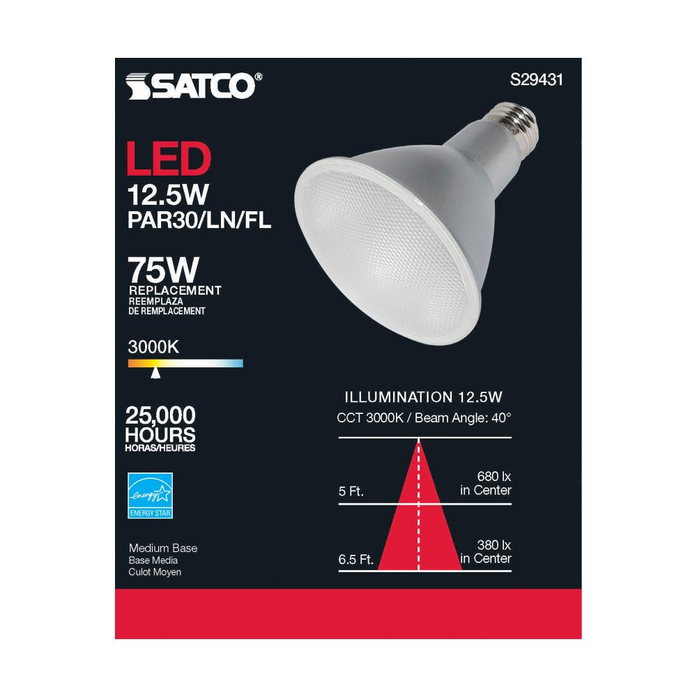 Satco's S29431 LED 12.5-watt, PAR30LN lamp maintains the familiar look of the Halogen PAR and Gen1 LED lamps they replace; but at 90 CRI and a higher lumens per watt ratio, it delivers superior light and improved efficiency. Designed for use in track,