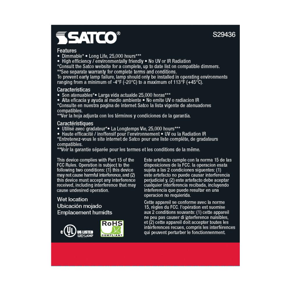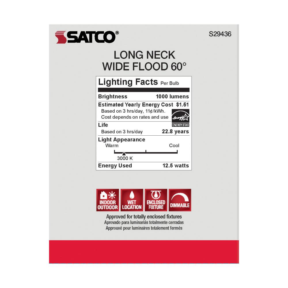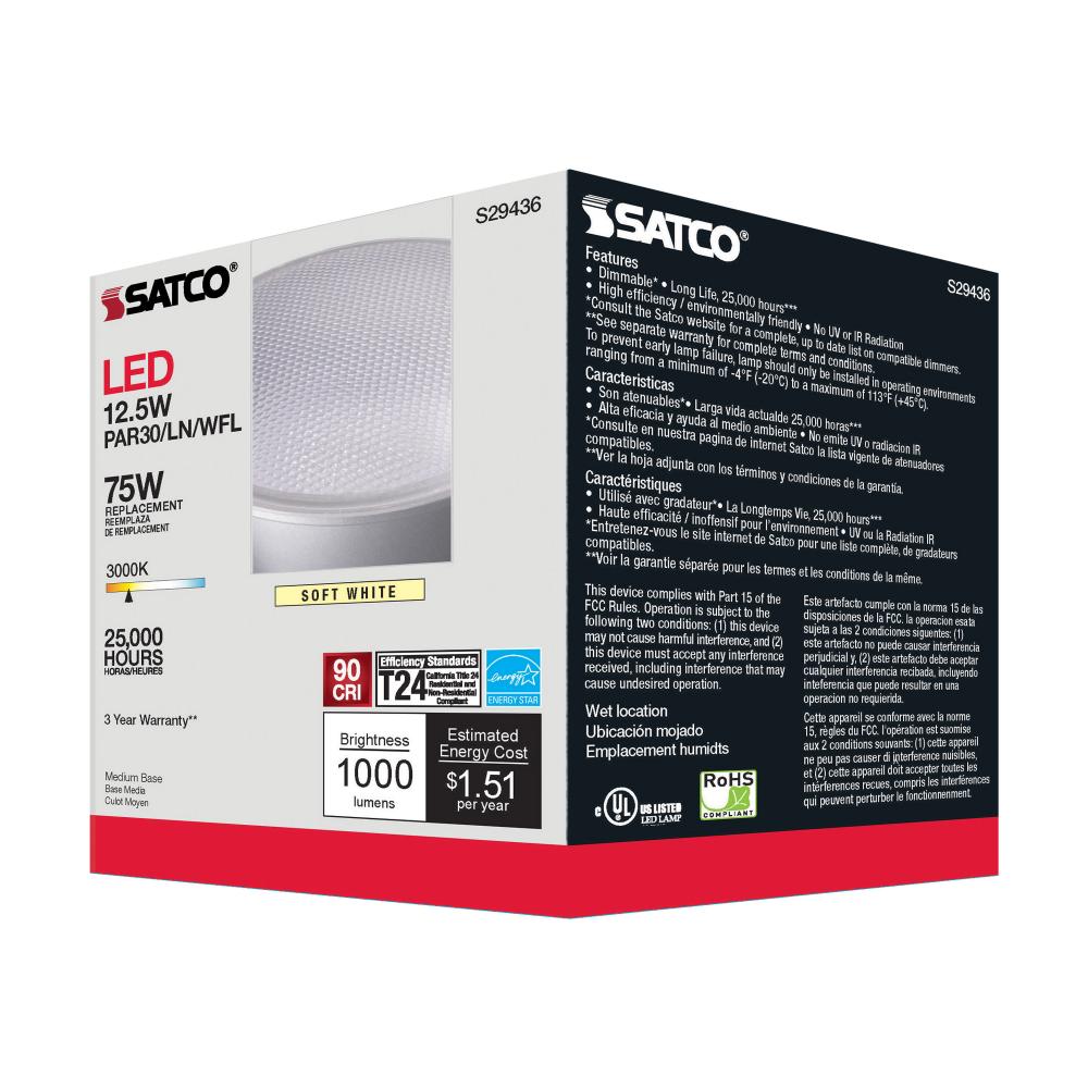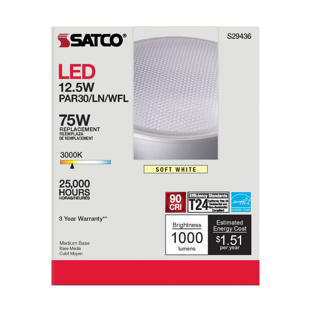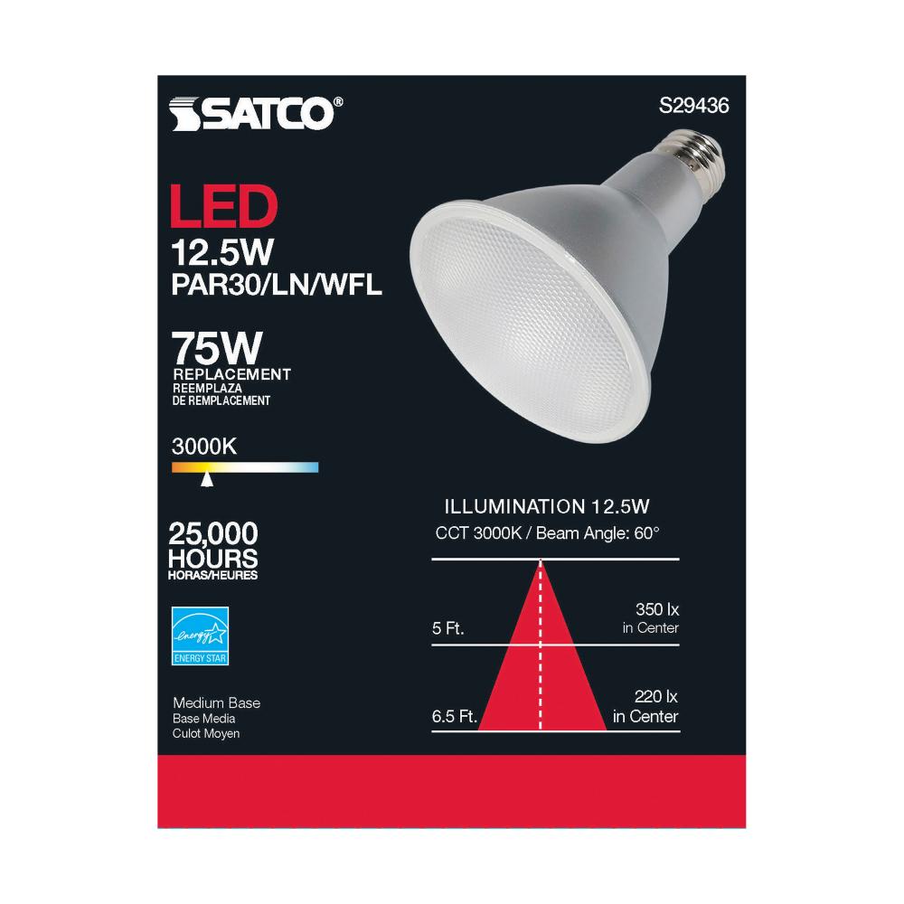 Satco's S29436 LED 12.5-watt, PAR30LN lamp maintains the familiar look of the Halogen PAR and Gen1 LED lamps they replace; but at 90 CRI and a higher lumens per watt ratio, it delivers superior light and improved efficiency. Designed for use in track,