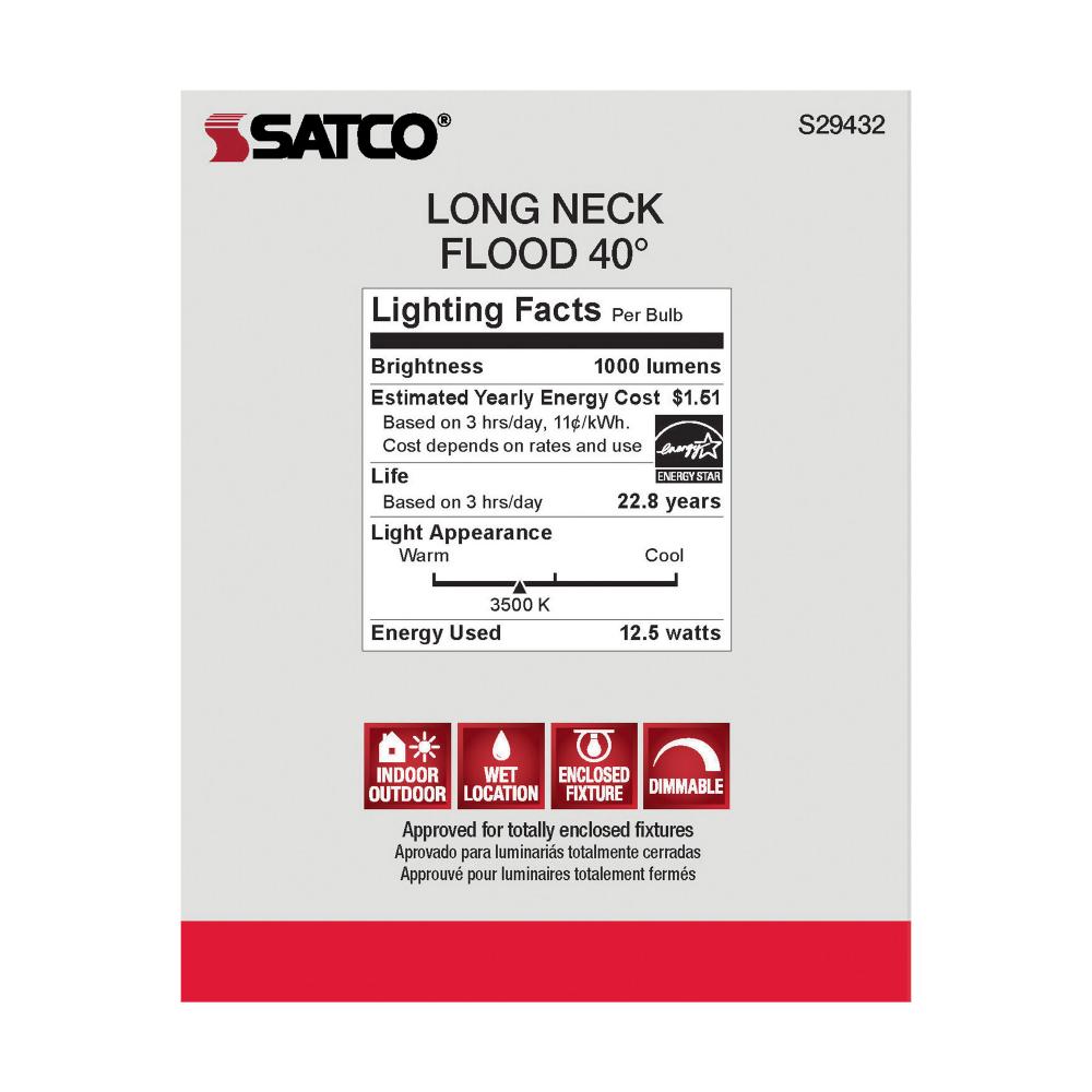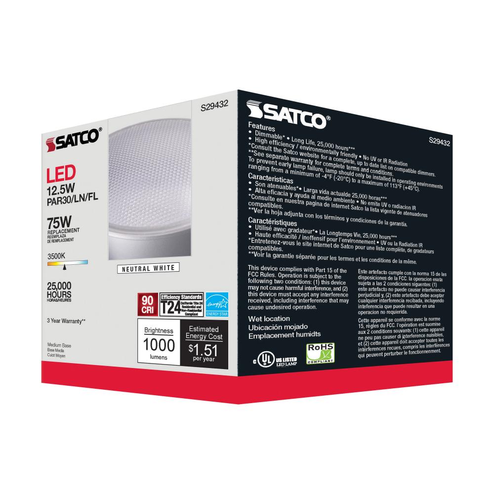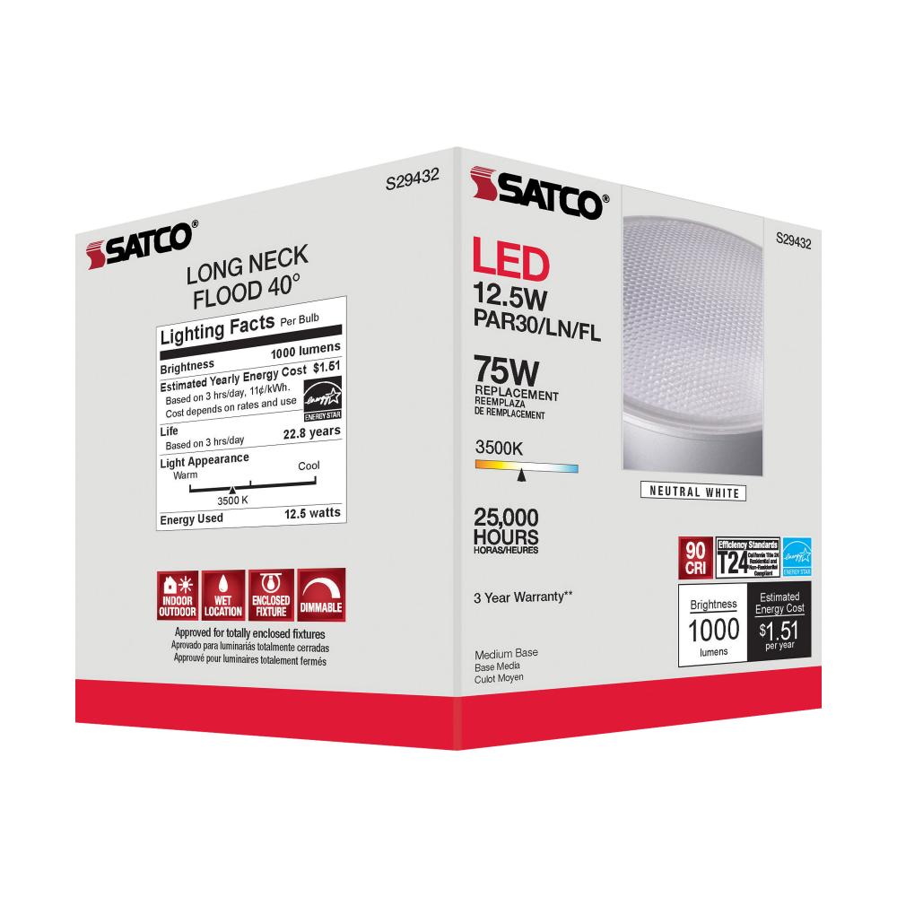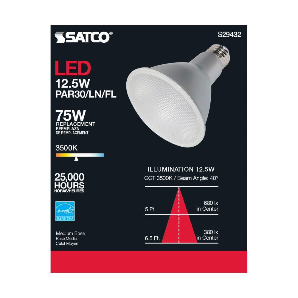 Satco's S29432 LED 12.5-watt, PAR30LN lamp maintains the familiar look of the Halogen PAR and Gen1 LED lamps they replace; but at 90 CRI and a higher lumens per watt ratio, it delivers superior light and improved efficiency. Designed for use in track,