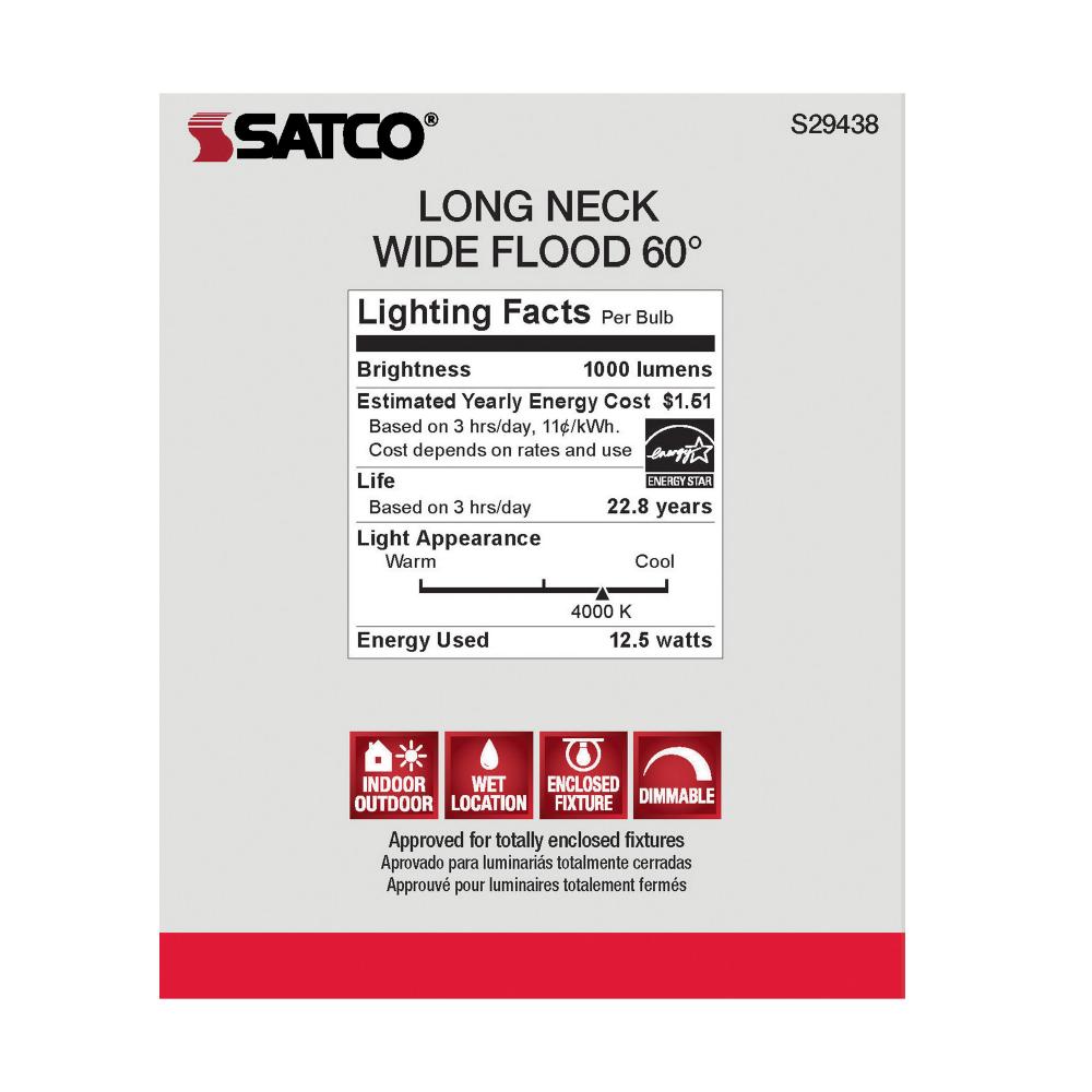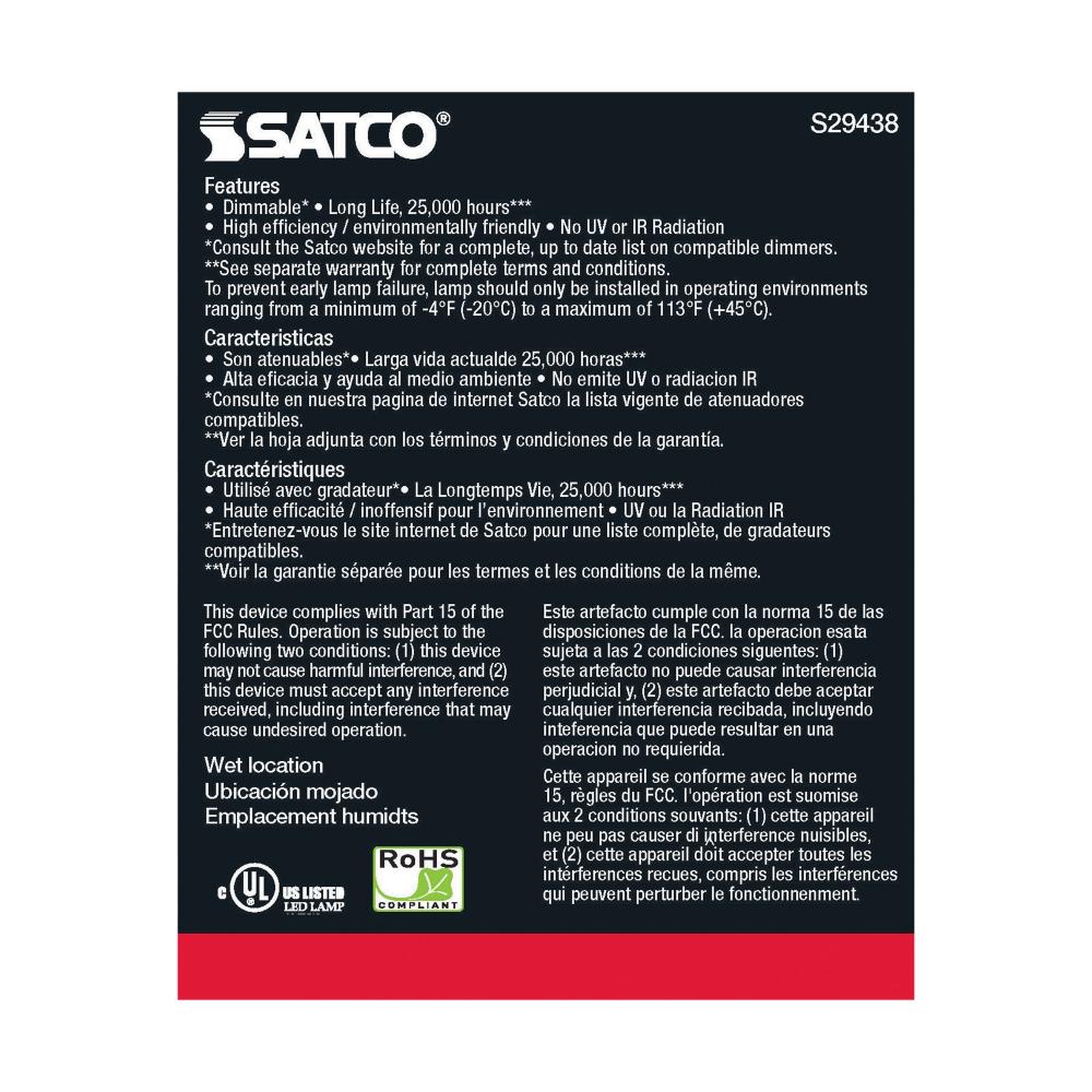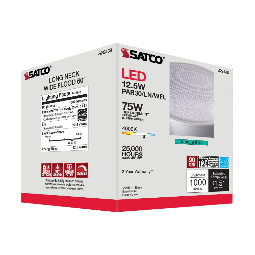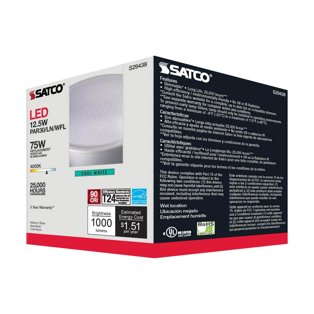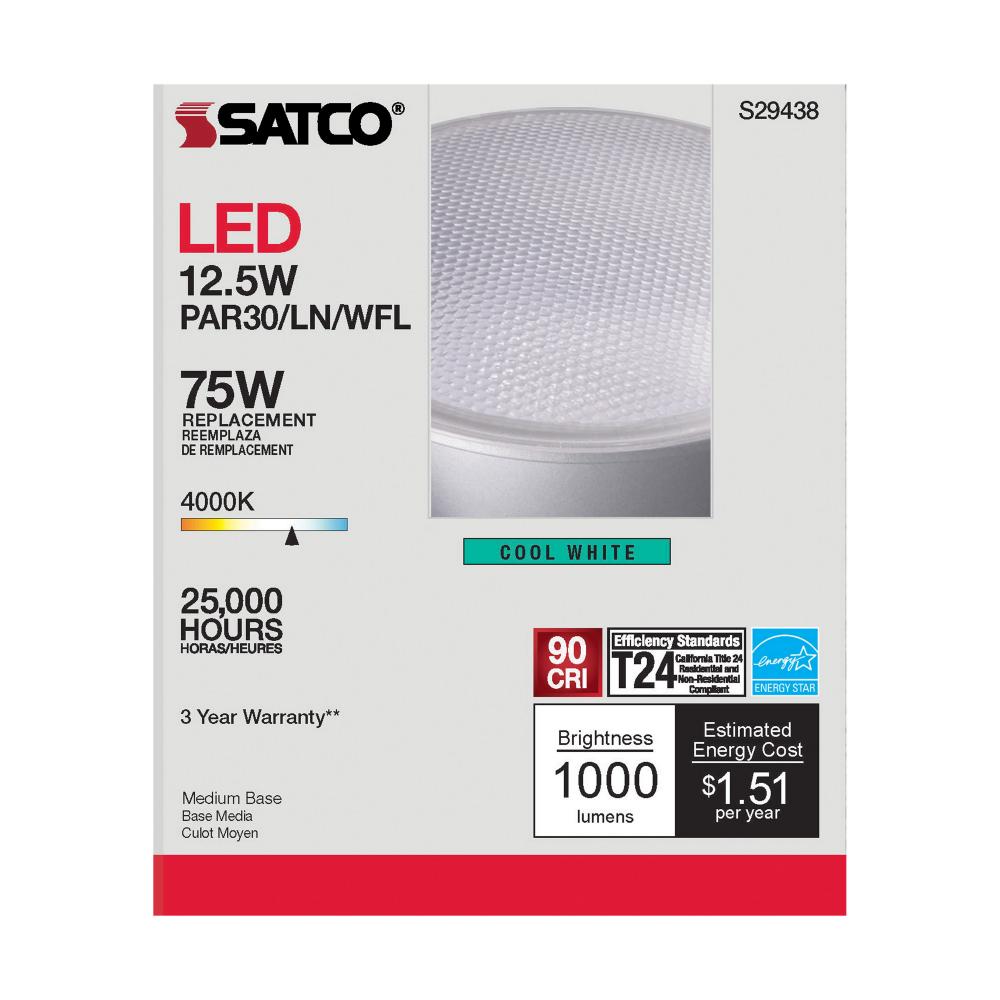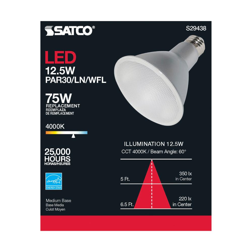 Satco's S29438 LED 12.5-watt, PAR30LN lamp maintains the familiar look of the Halogen PAR and Gen1 LED lamps they replace; but at 90 CRI and a higher lumens per watt ratio, it delivers superior light and improved efficiency. Designed for use in track,