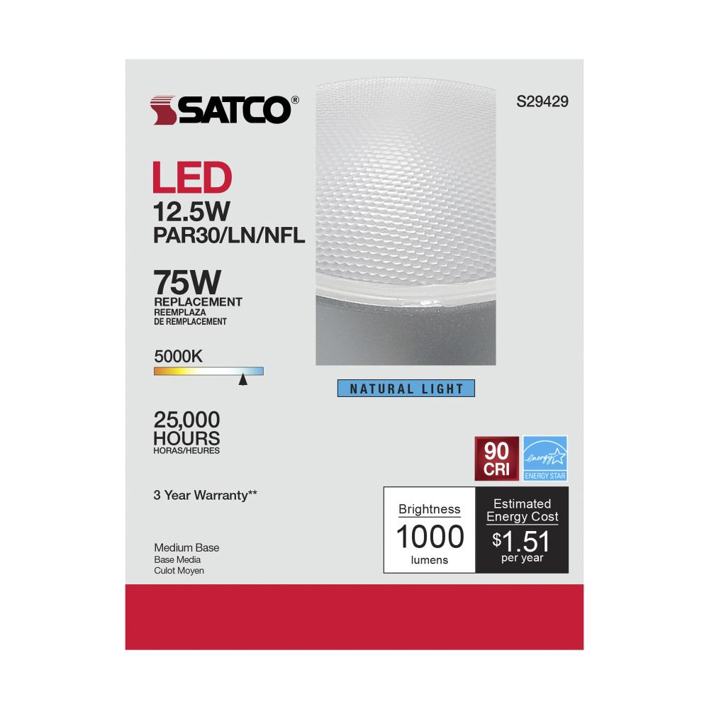 Satco's S29429 LED 12.5-watt, PAR30LN lamp maintains the familiar look of the Halogen PAR and Gen1 LED lamps they replace; but at 90 CRI and a higher lumens per watt ratio, it delivers superior light and improved efficiency. Designed for use in track,