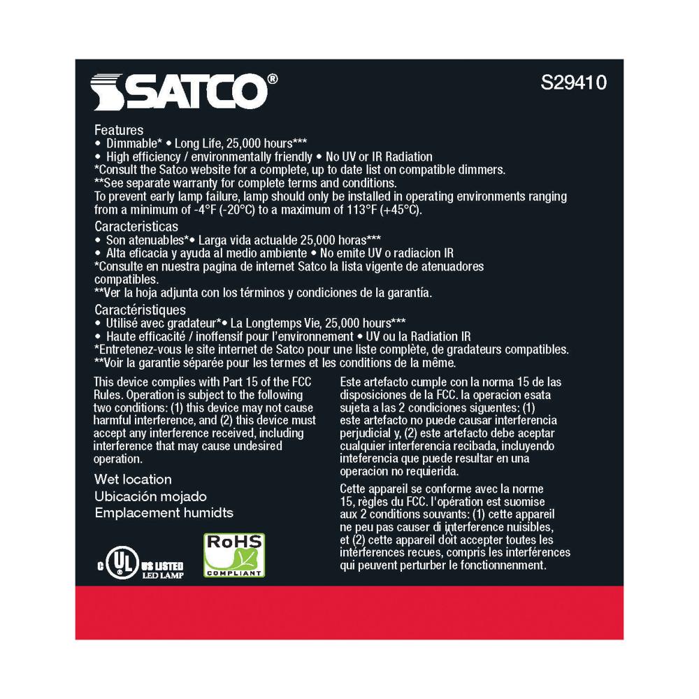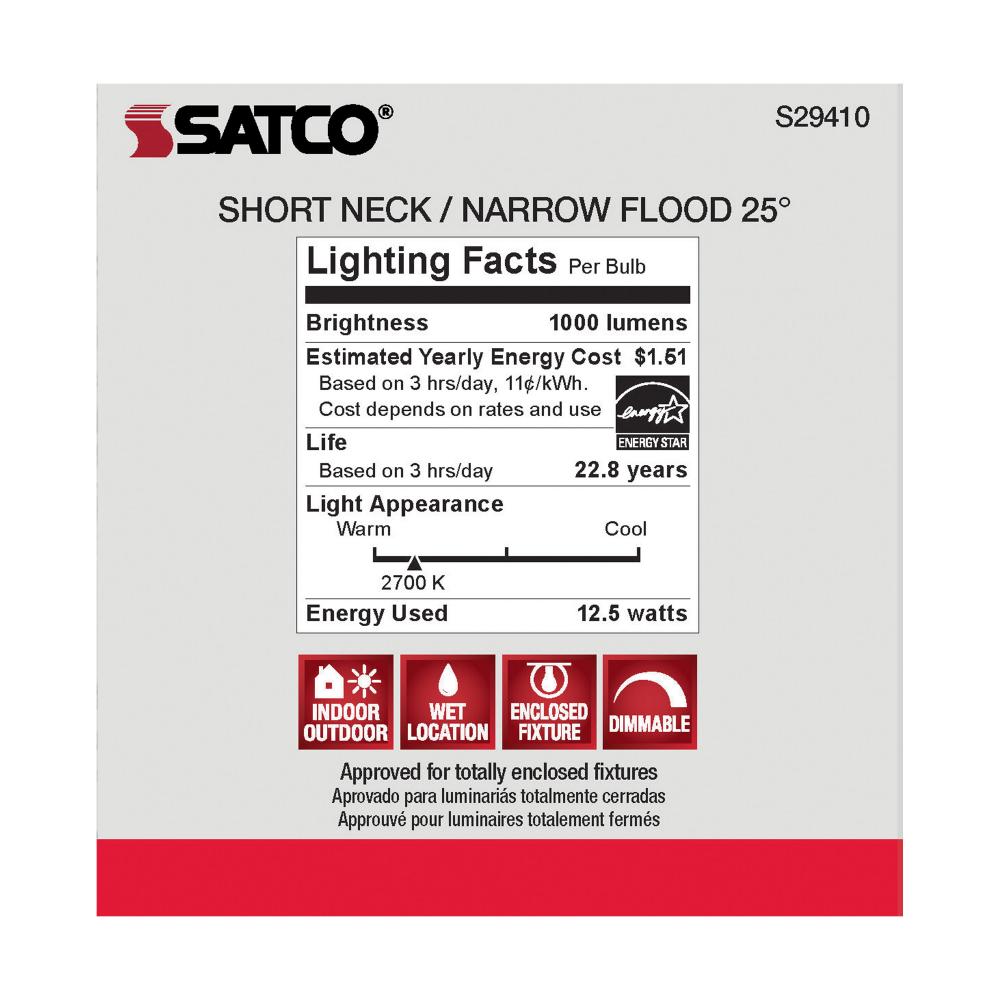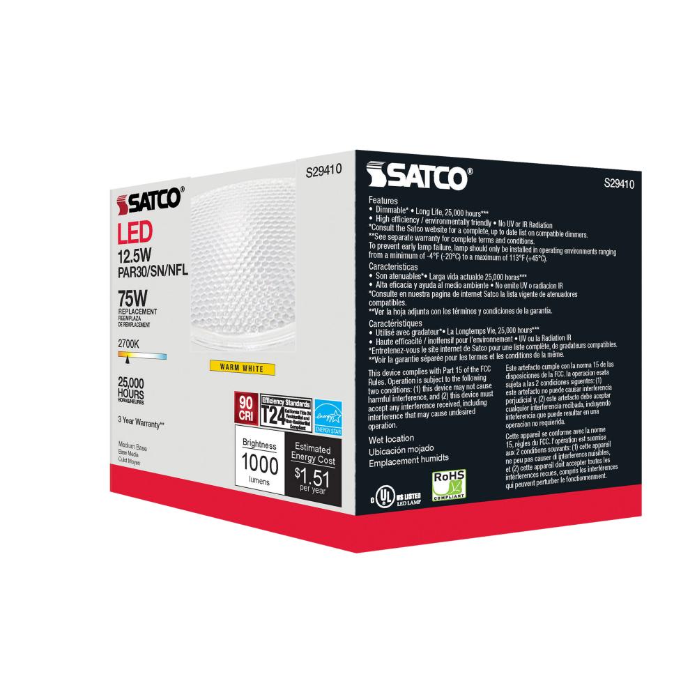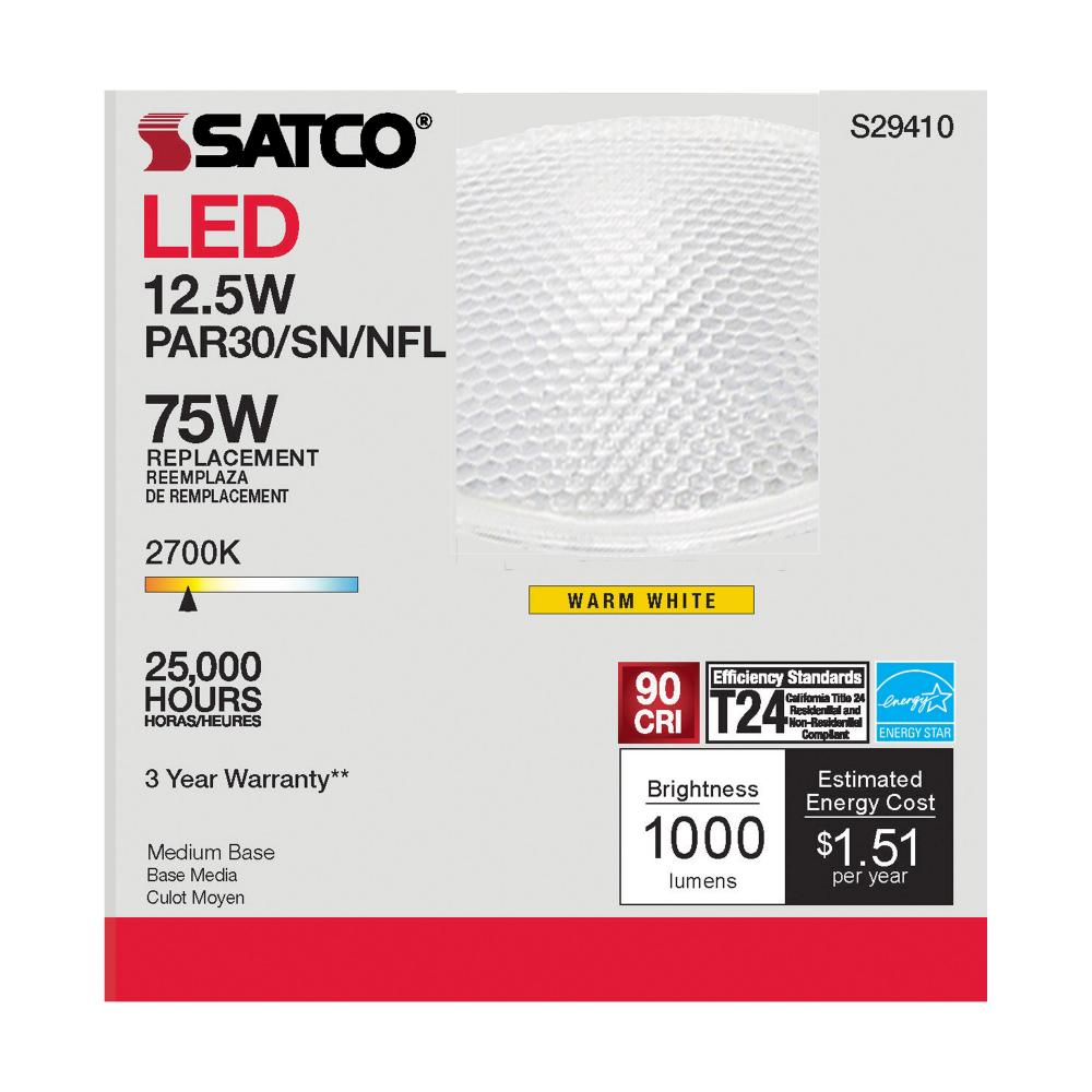 Satco's S29410 LED 12.5-watt, PAR30SN lamp maintains the familiar look of the Halogen PAR and Gen1 LED lamps they replace; but at 90 CRI and a higher lumens per watt ratio, it delivers superior light and improved efficiency. Designed for use in track,