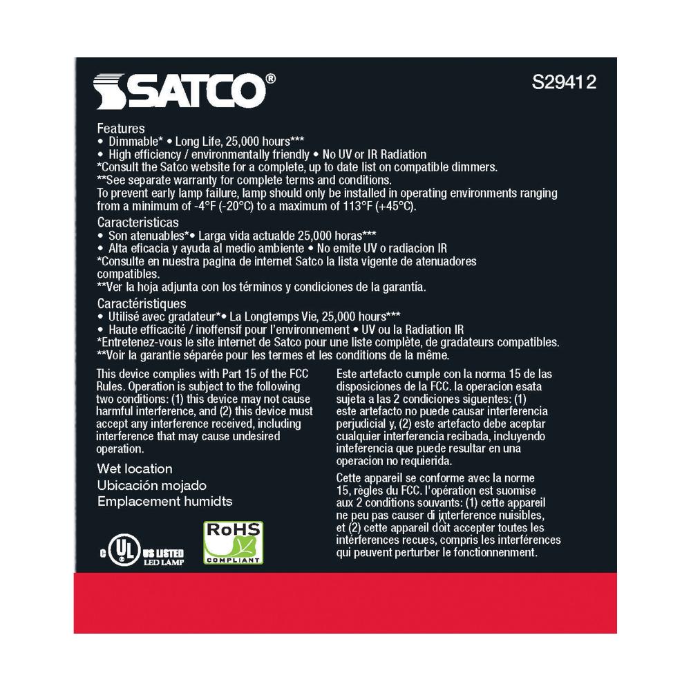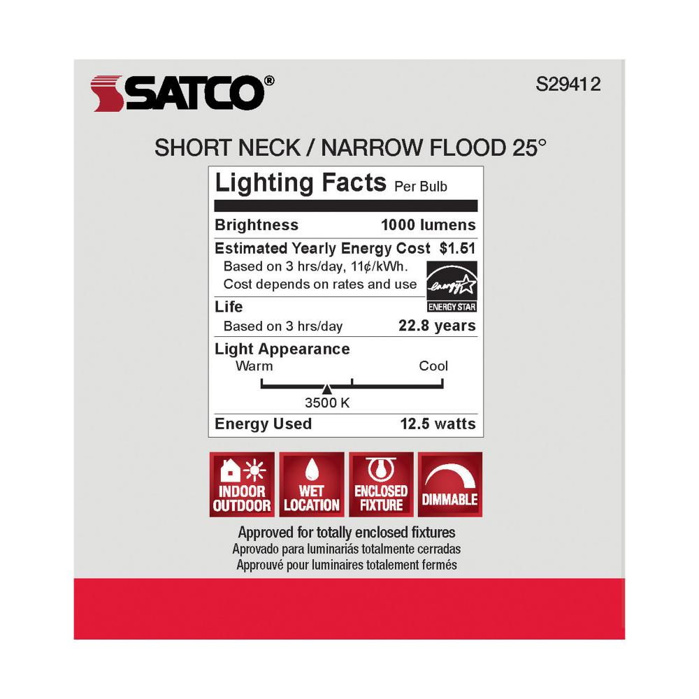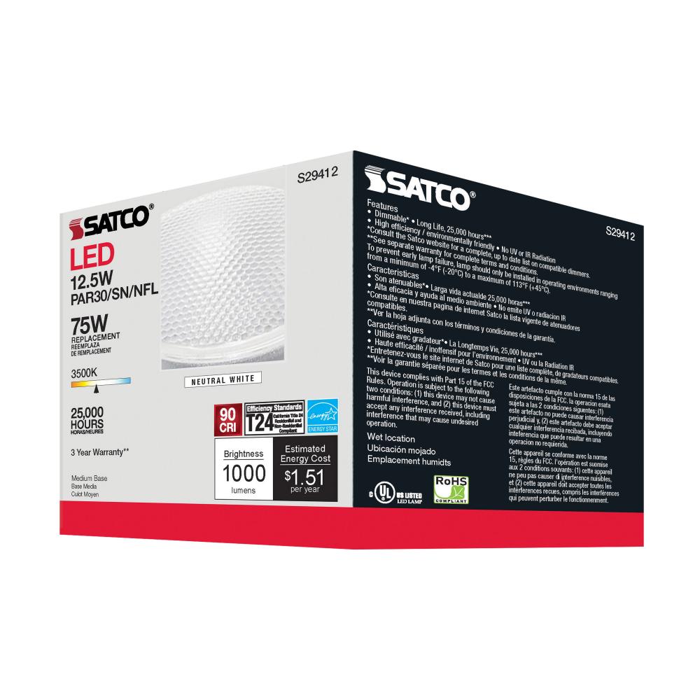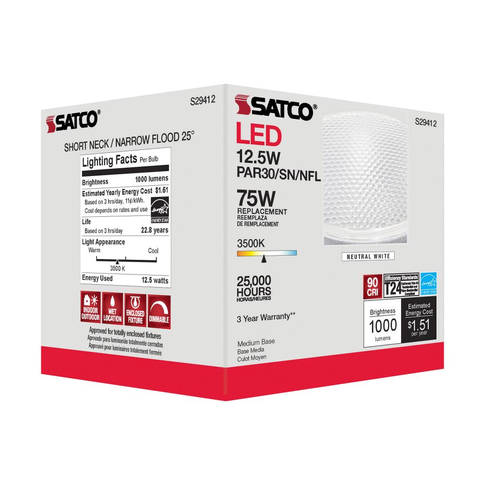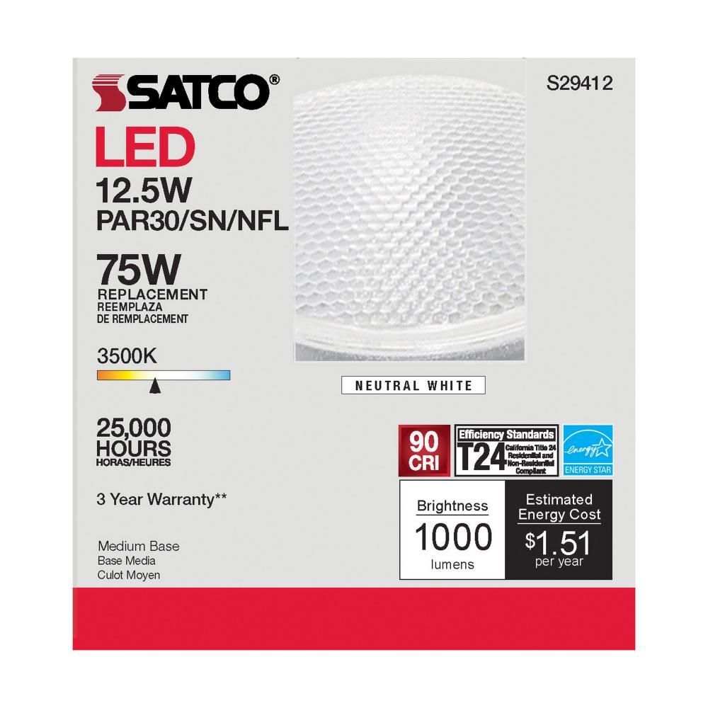 Satco's S29412 LED 12.5-watt, PAR30SN lamp maintains the familiar look of the Halogen PAR and Gen1 LED lamps they replace; but at 90 CRI and a higher lumens per watt ratio, it delivers superior light and improved efficiency. Designed for use in track,