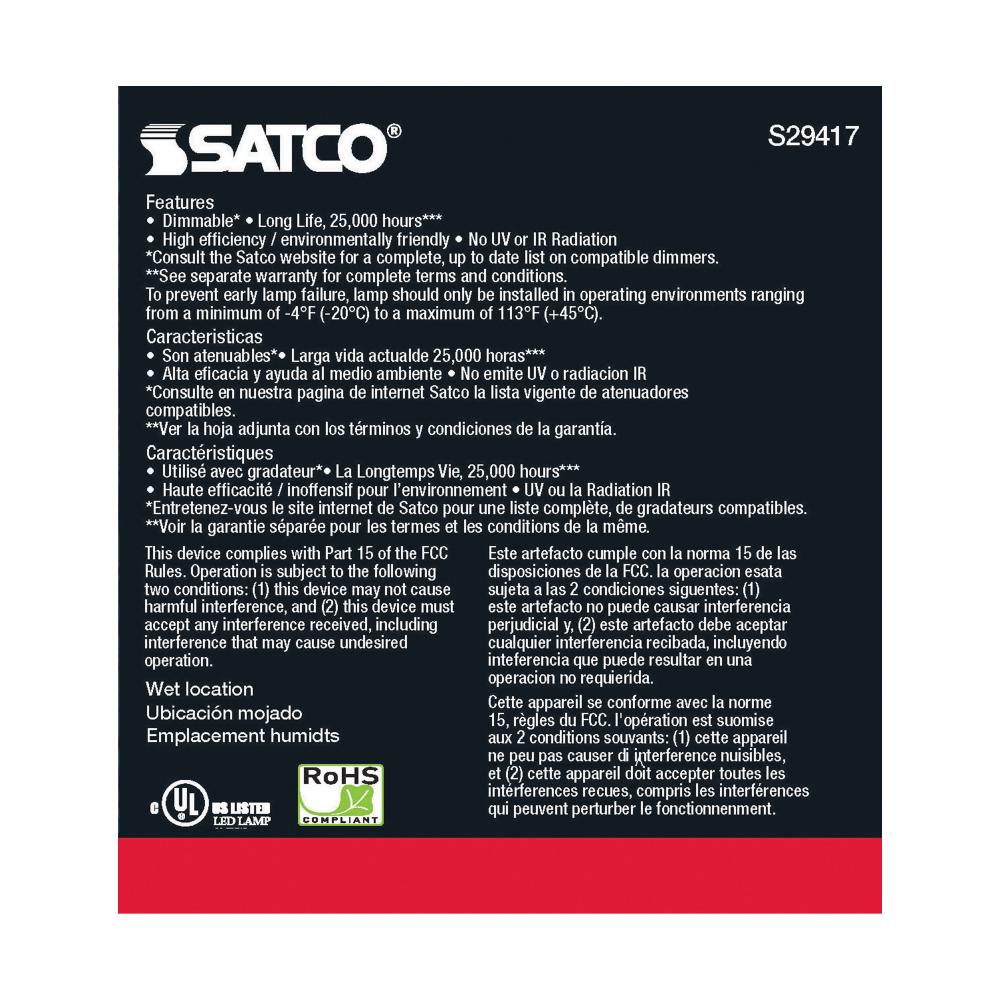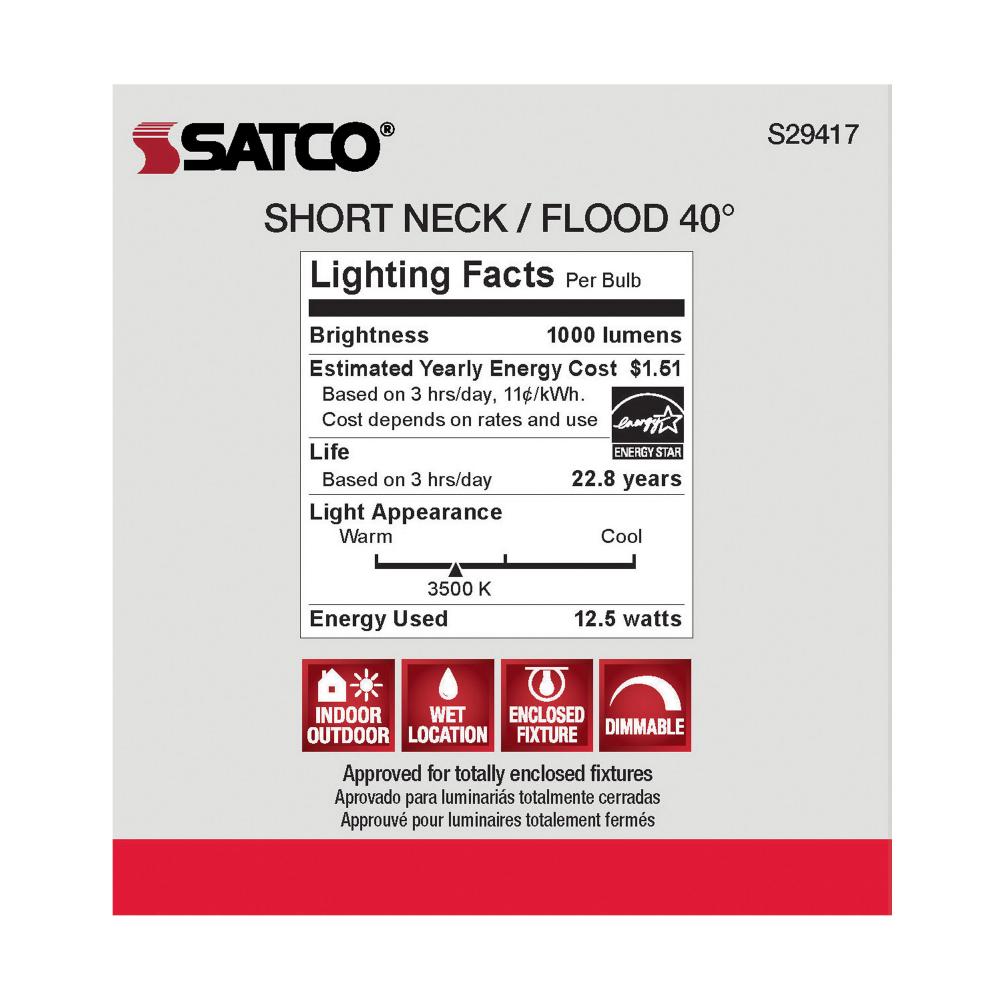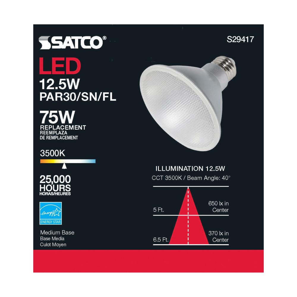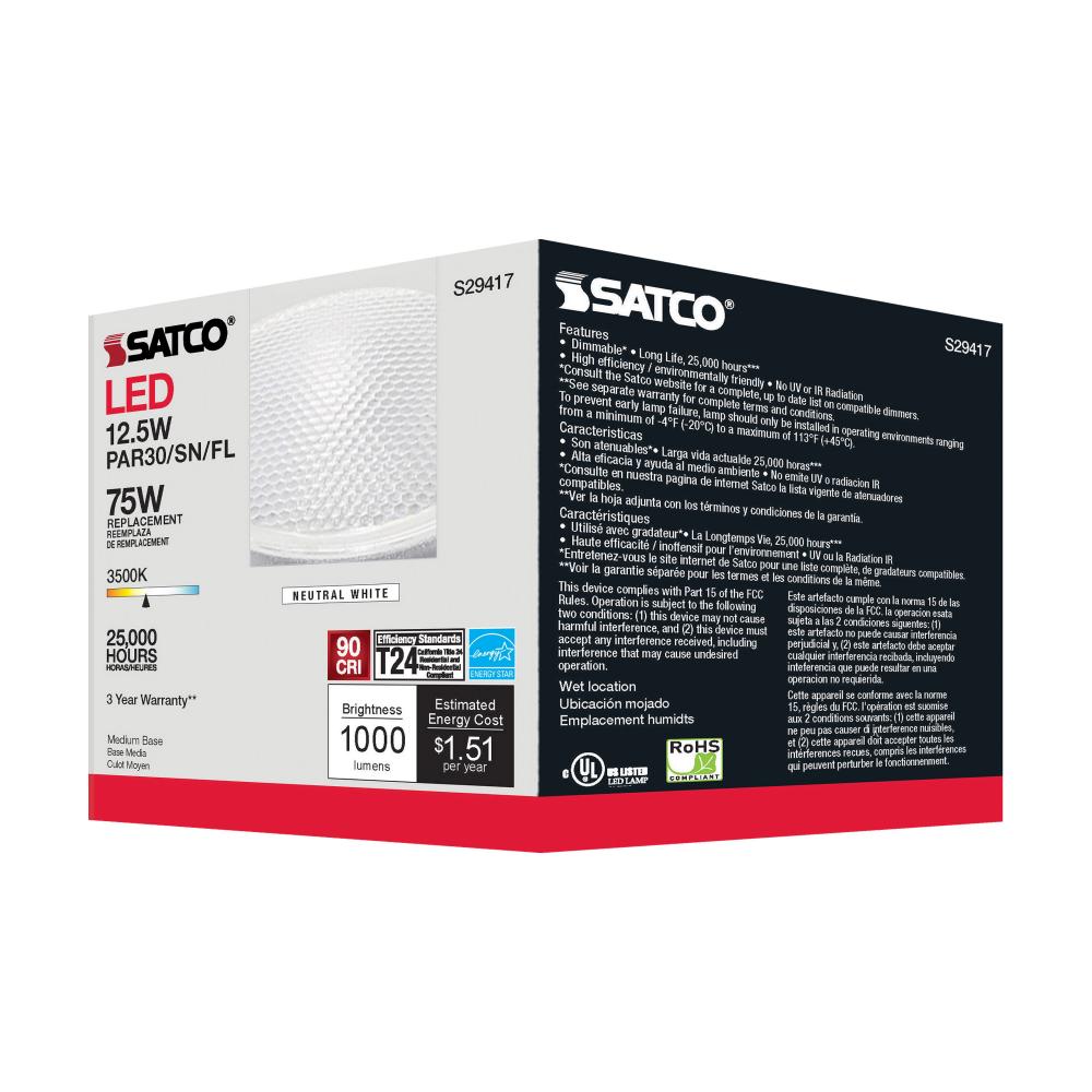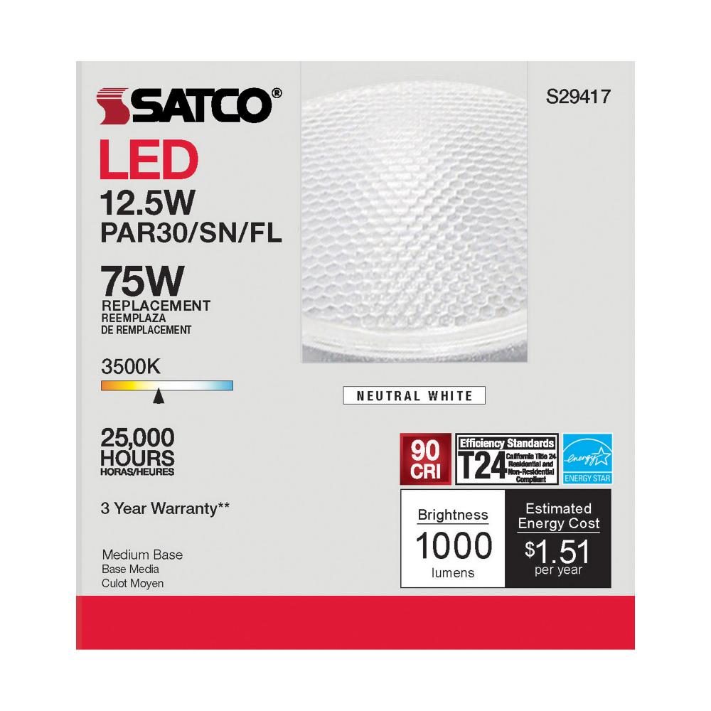 Satco's S29417 LED 12.5-watt, PAR30SN lamp maintains the familiar look of the Halogen PAR and Gen1 LED lamps they replace; but at 90 CRI and a higher lumens per watt ratio, it delivers superior light and improved efficiency. Designed for use in track,