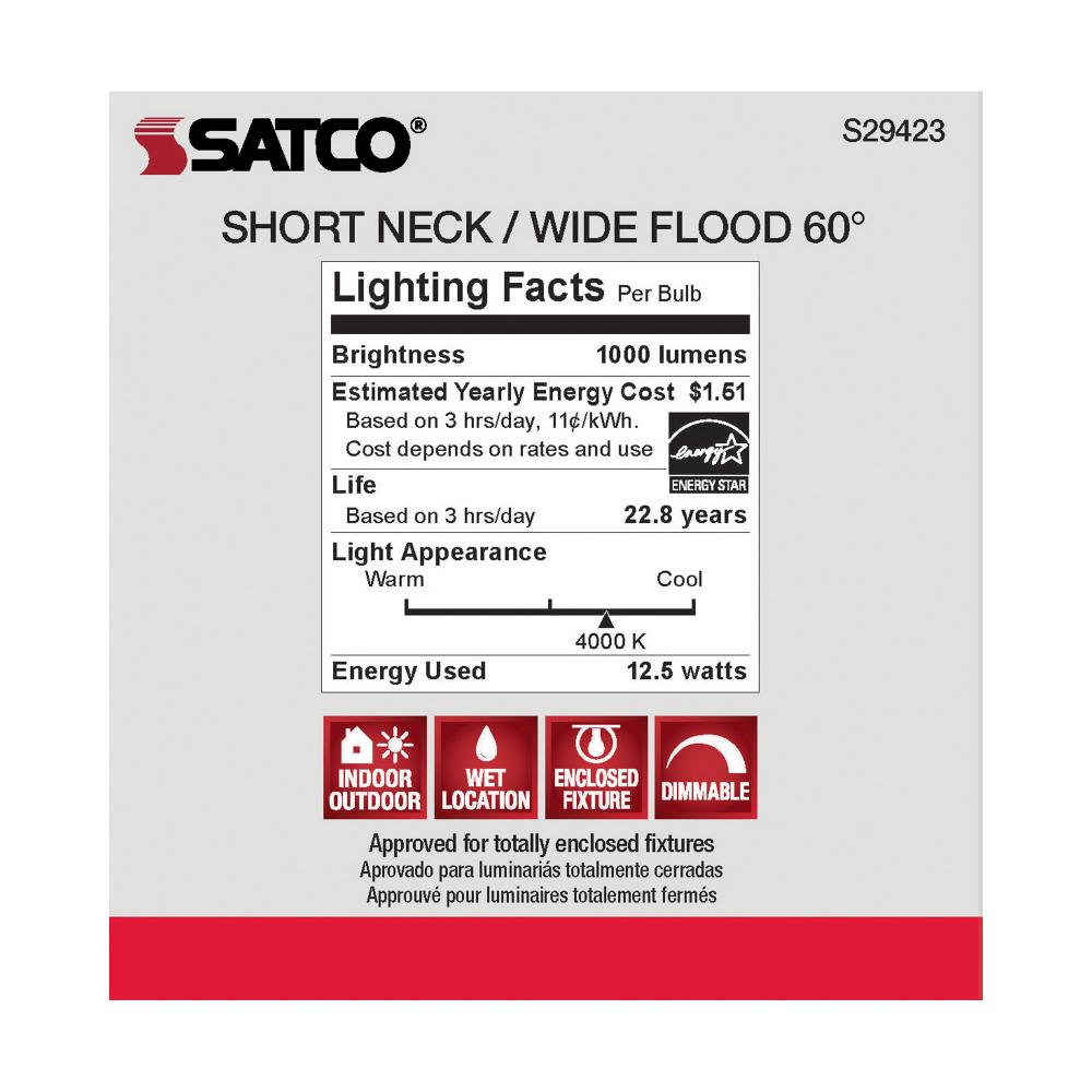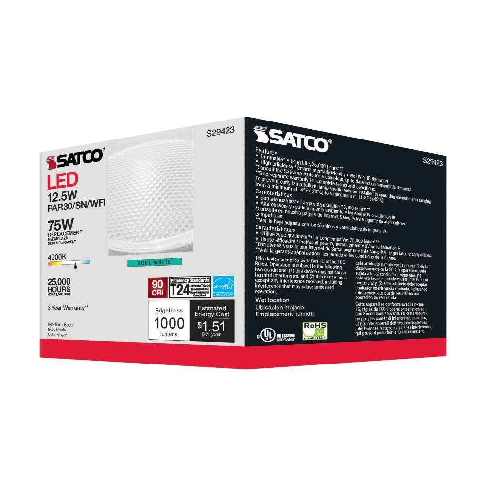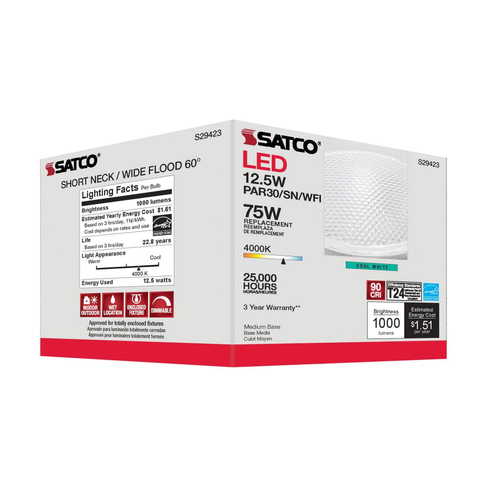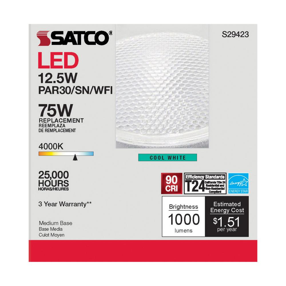 Satco's S29423 LED 12.5-watt, PAR30SN lamp maintains the familiar look of the Halogen PAR and Gen1 LED lamps they replace; but at 90 CRI and a higher lumens per watt ratio, it delivers superior light and improved efficiency. Designed for use in track,
