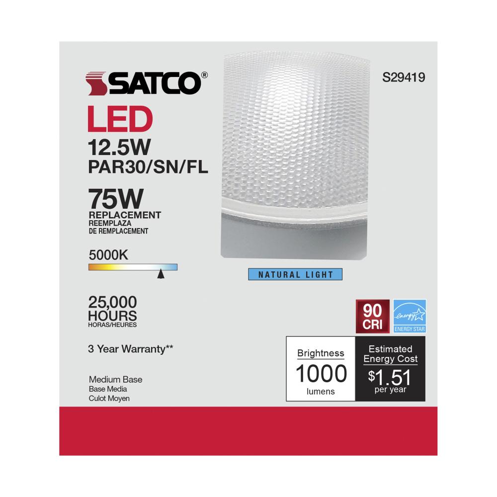 Satco's S29419 LED 12.5-watt, PAR30SN lamp maintains the familiar look of the Halogen PAR and Gen1 LED lamps they replace; but at 90 CRI and a higher lumens per watt ratio, it delivers superior light and improved efficiency. Designed for use in track,